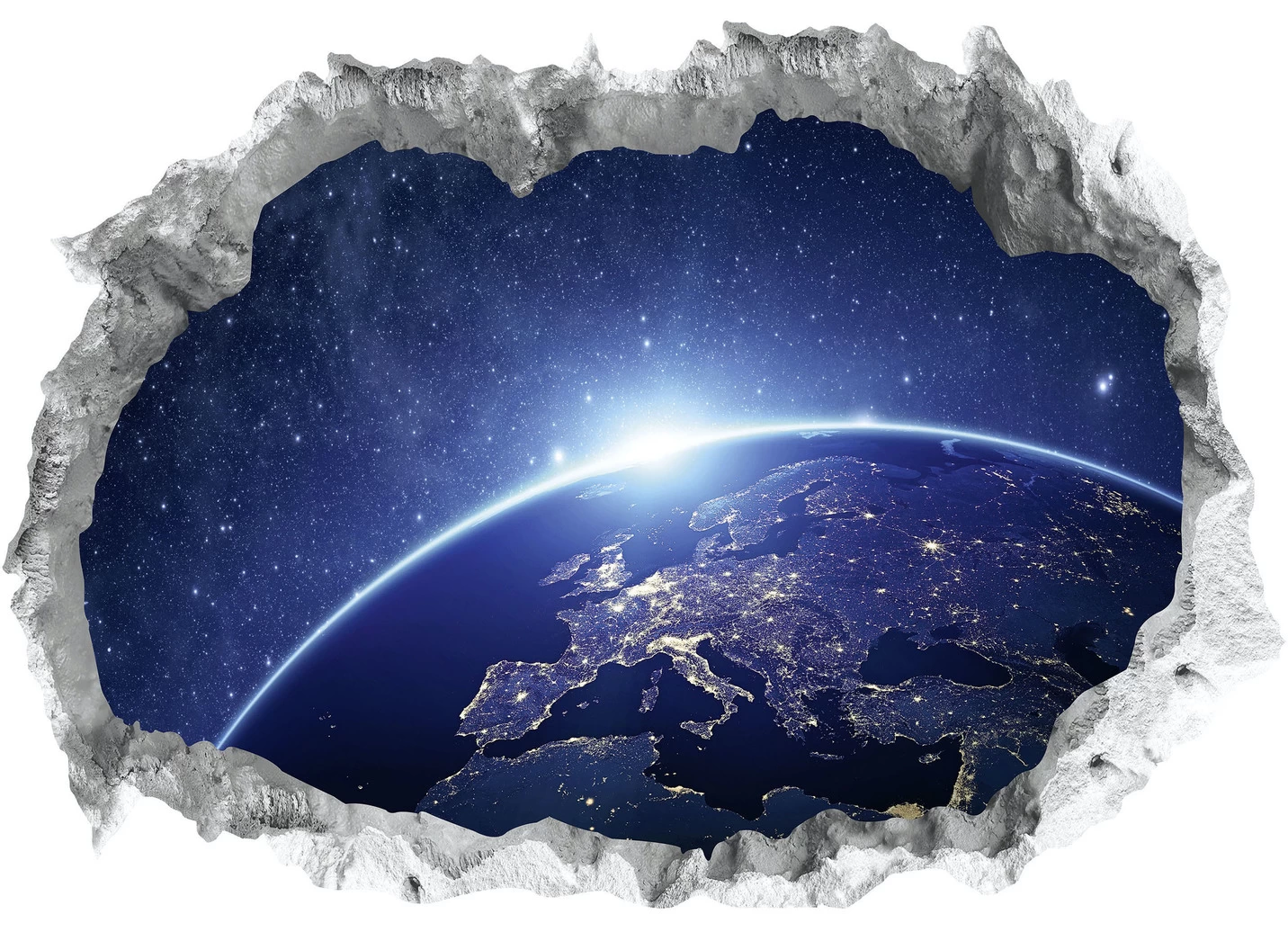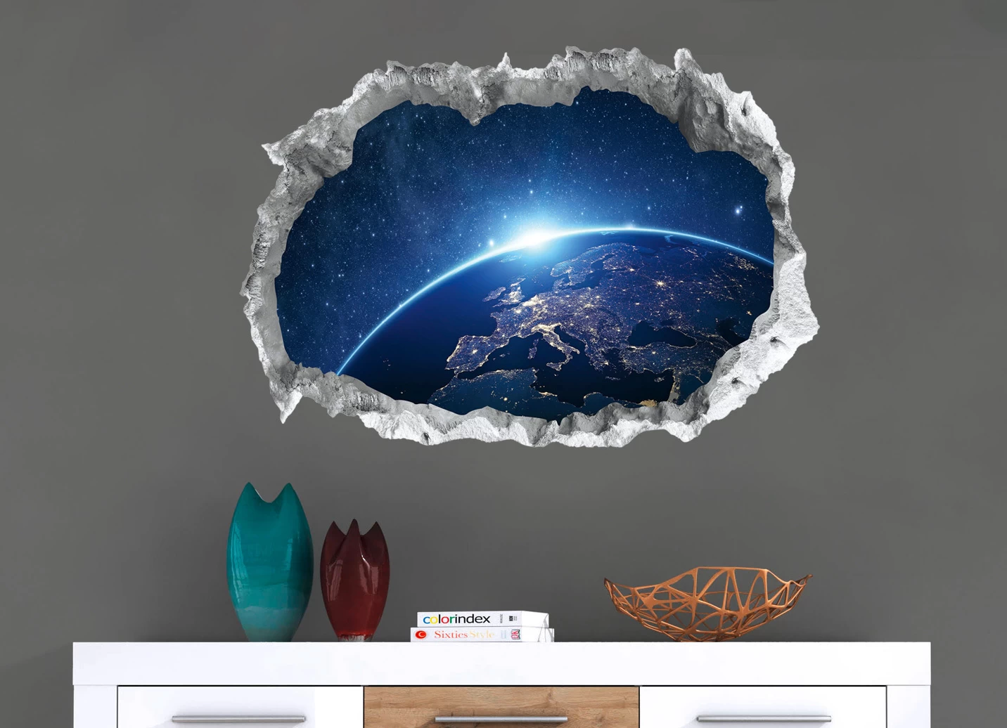 Holen Sie sich Ihr Lieblingsmotiv in Ihr Zuhause! mit dies tollen Wand-Tattoos sieht es so aus, als würde durch den Wanddurchbruch eine andere Welt im Hintergrund auftauchen.