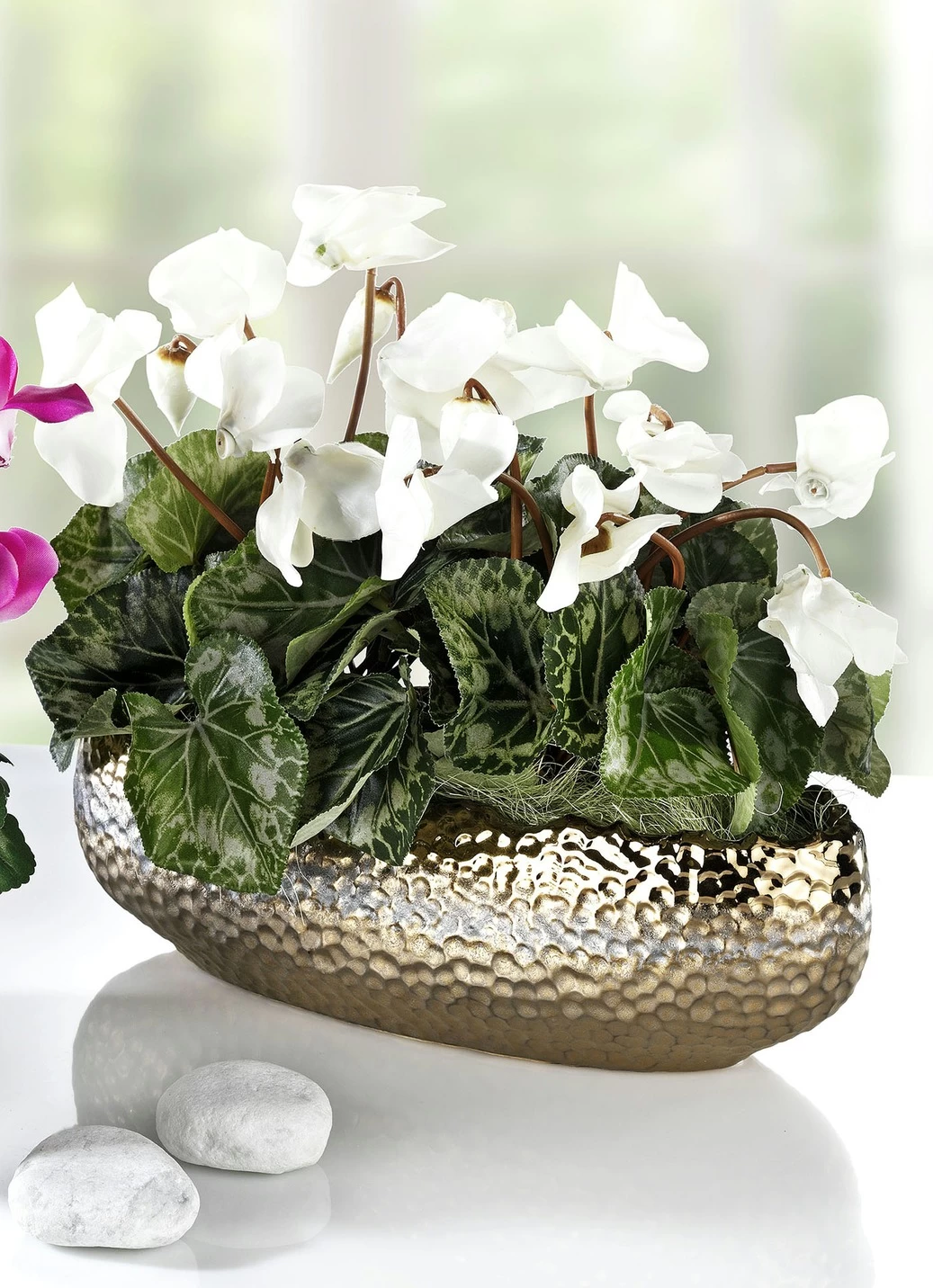 Ein echter Traum an Blütenpracht und Hochwertigkeit sind diese täuschend echt aussehenden Alpenveilchen im Keramiktopf. Mit Naturmoos dekoriert. Blüten und Blätter sind aus Kunst- und Textilmaterial gefertigt.