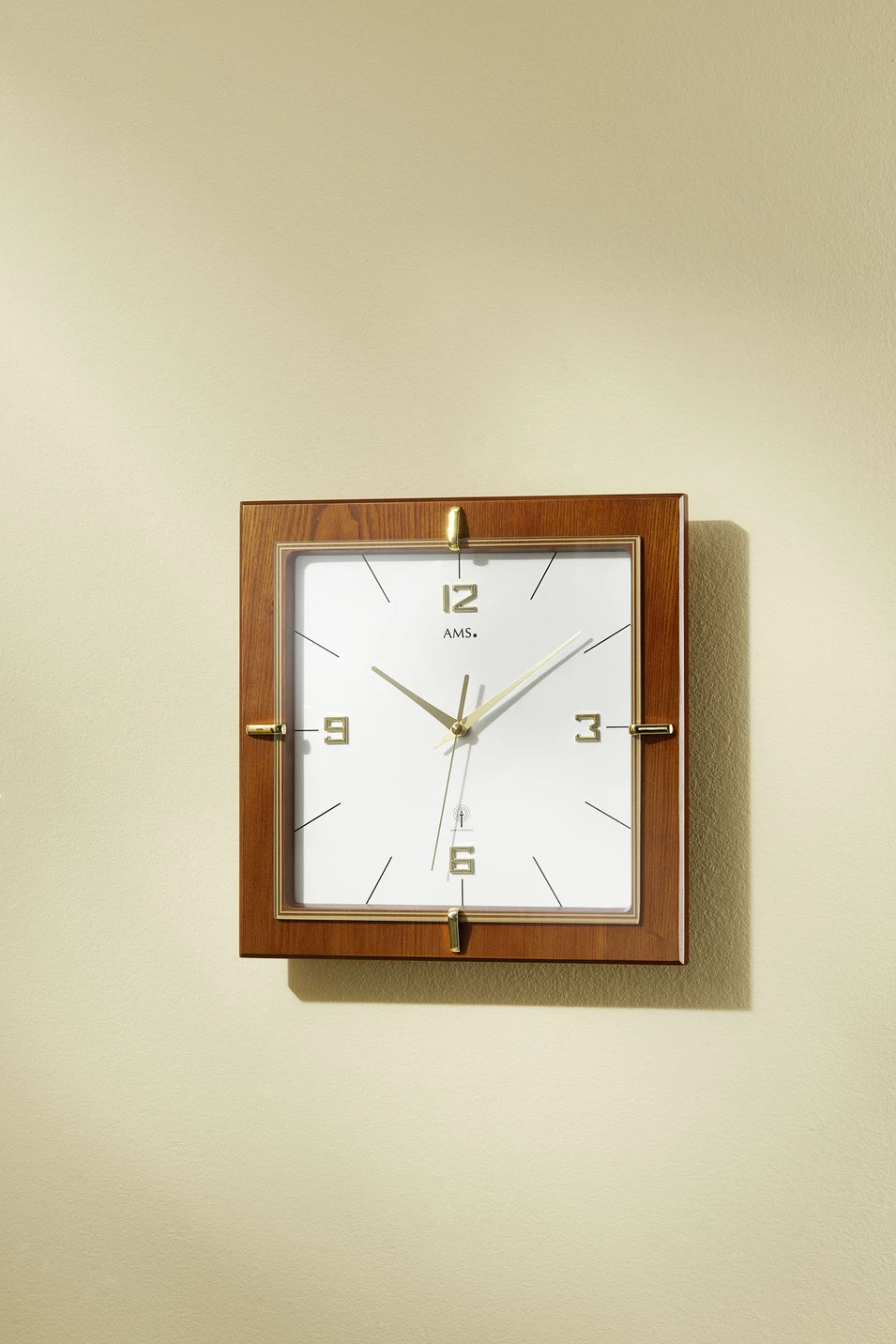 Klassische Wanduhr aus dem Hause „AMS“, mit einem hochwertigen, nussbaumfarbenen MDF-Rahmen, einer Mineralglasabdeckung und hochwertigem Funkuhrwerk. Auf das weiße Zifferblatt wurden die goldfarbenen, arabischen Ziffern aufgelegt. Batteriebetrieben mit 1x 1,5 Volt Mignon Batterie (nicht im Lieferumfang enthalten).