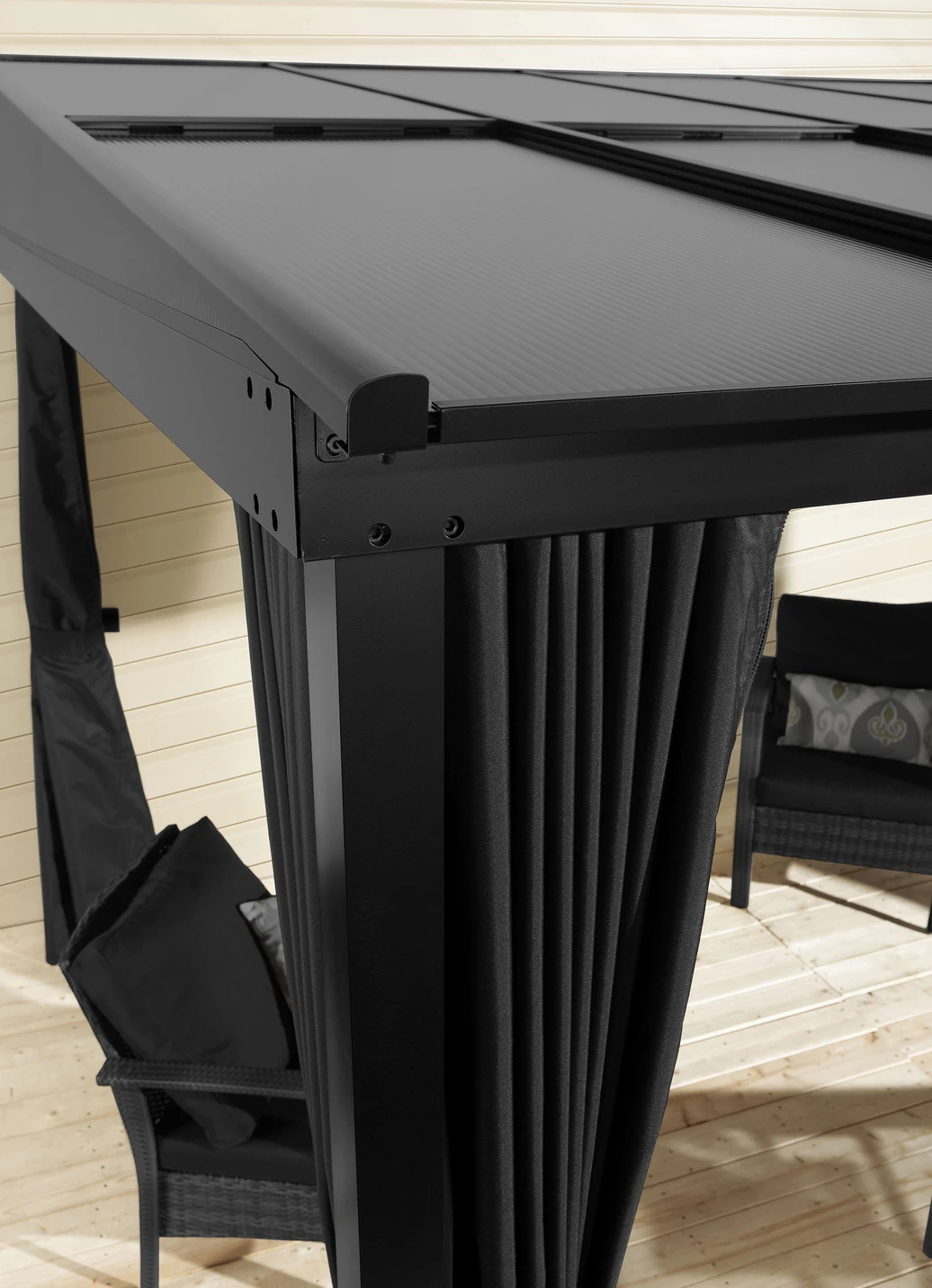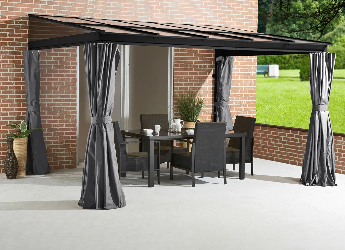 Das Gleiche gilt für die stabile Konstruktion aus dauerhaft rostfreiem, pulverbeschichtetem Aluminium (Pfostenstärke 7,6 cm) mit Schrauben aus rostfreiem Edelstahl. Die Terrassenüberdachung kann somit das ganze Jahr stehen bleiben und muss im Winter nicht abgebaut werden. Die mitgelieferten Schneelaststützen geben zusätzlichen Halt. In edlem Anthrazit, inklusive passenden Moskitonetzen (Nylon) und Vorhängen (Polyester 180 g/m²), welche dank zweigleisigen Schienen zusammen angebracht werden können.