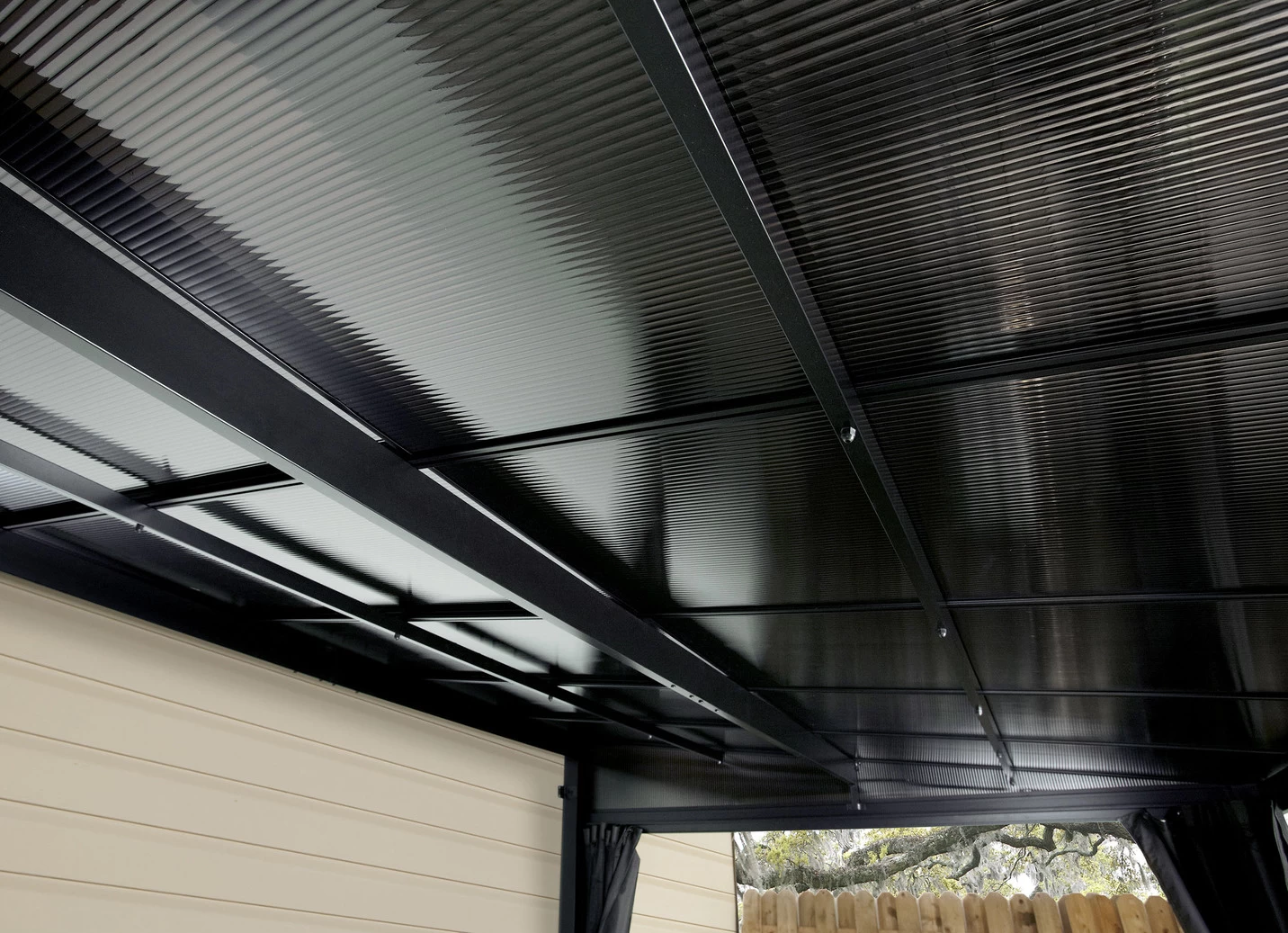 Das Dach dieser modernen und langlebigen Terrassenüberdachung besteht aus 8 mm Doppelstegplatten und zwei verstärkten Stangen. Diese gewährleisten eine besonders hohe Stabilität und halten Witterungen wie Regen, Schnee (Dachlast 125 kg/m²) und Sonne (UV) problemlos stand.
