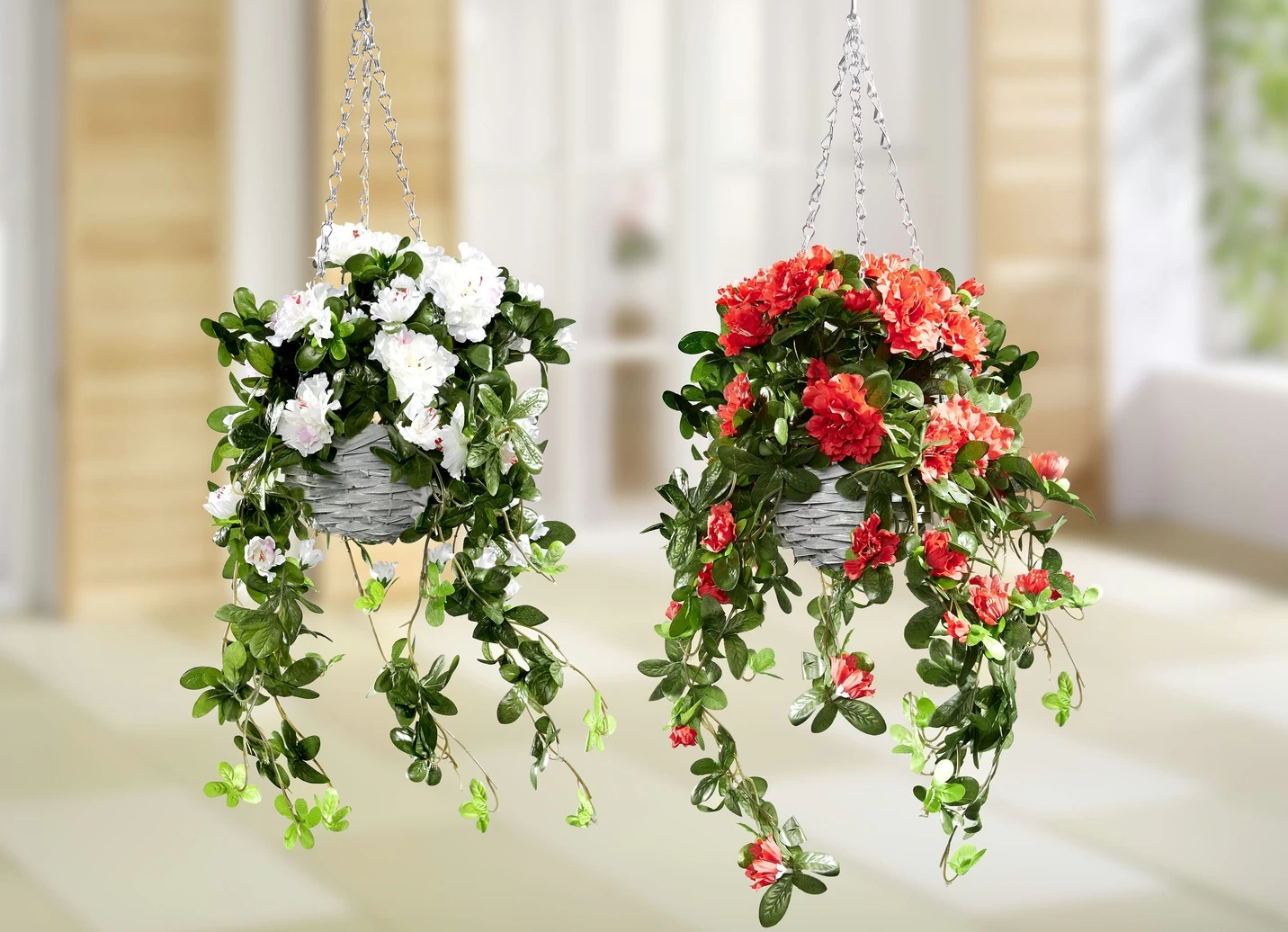 Täuschend echt wirkende Azaleen aus Textil und Kunstmaterial, die fest in einen Weidenkorb eingesetzt wurden. Mit praktischer Aufhängung. Maße: Länge ca. 70 cm; Topf ø 16 cm, Höhe 10 cm.
