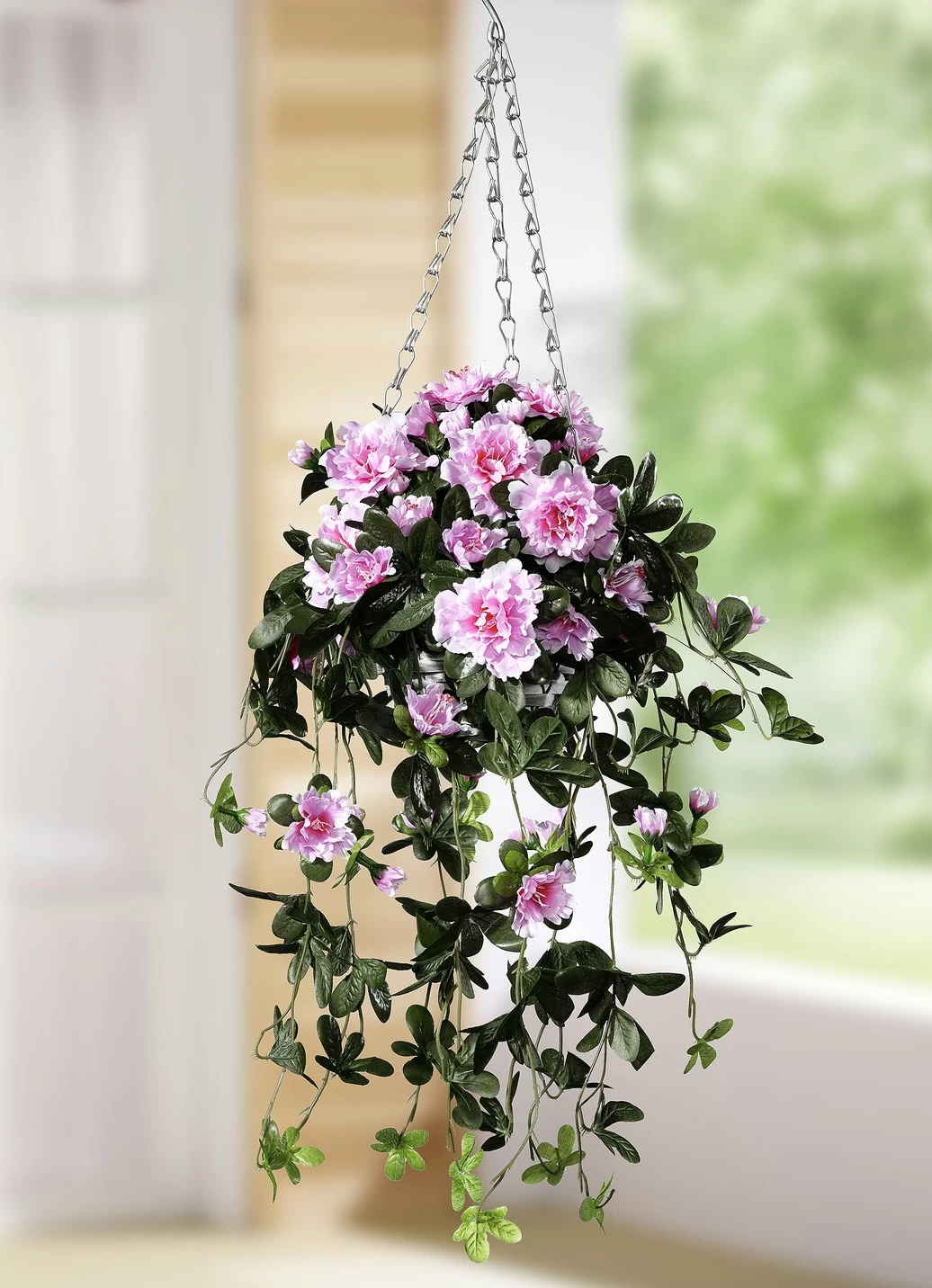Täuschend echt wirkende Azaleen aus Textilund Kunstmaterial, die fest in einen Weidenkorb eingesetzt wurden. Mit praktischer Aufhängung. Maße: Länge ca. 75 cm; Topf ø 16 cm, Höhe 11 cm.