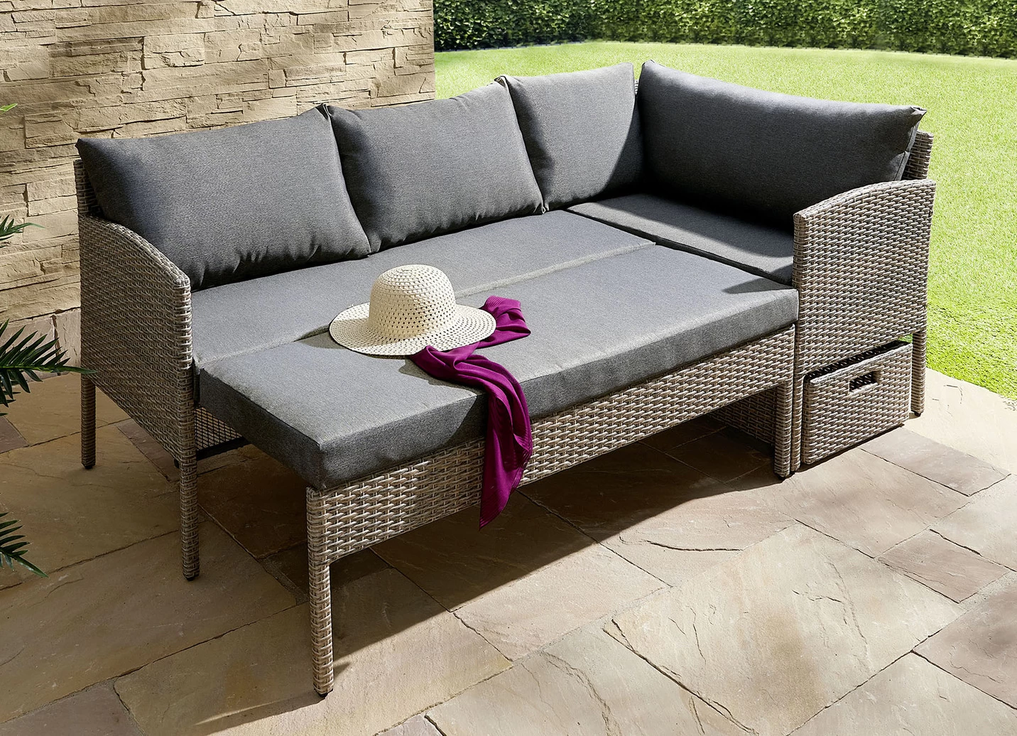 Der besondere Clou: der Tisch mit Glasplatte ist in 2 Stufen höhenverstellbar und kann daher individuell an Ihre Bedürfnisse angepasst werden. Dank der ausziehbaren Bank entsteht im Nu eine komfortable Liegefläche. Das strapazierfähige Kunststoffgeflecht in naturgrau wurde von Hand auf ein stabiles, pulverbeschichtetes Stahlgestell gespannt. Die bequemen Sitz- und Rückenkissen sind im Lieferumfang enthalten (Schaumstofffüllung aus 100% Polyurethan; Bezug aus 100% Polyester). Belastbar bis 240 kg.