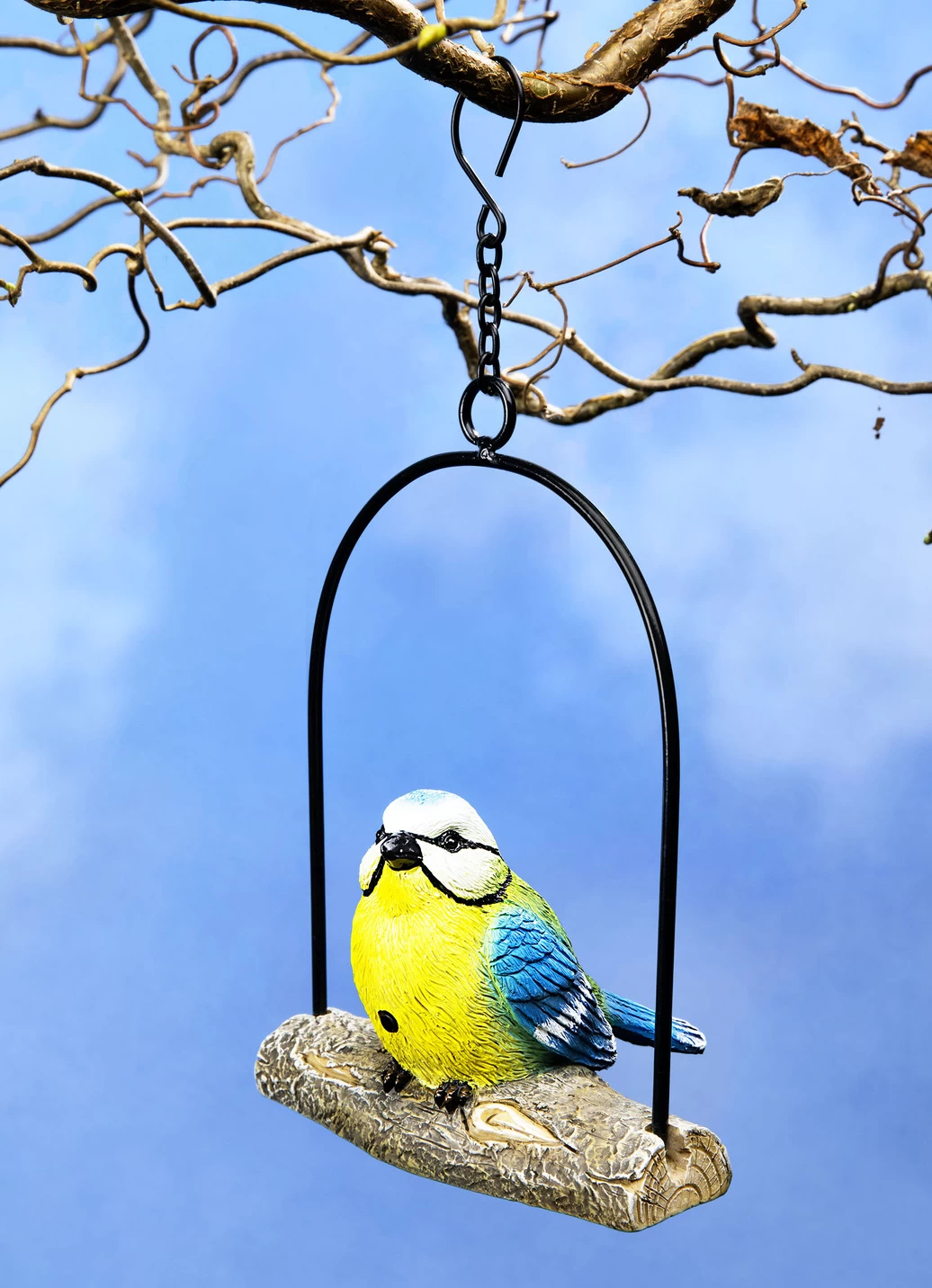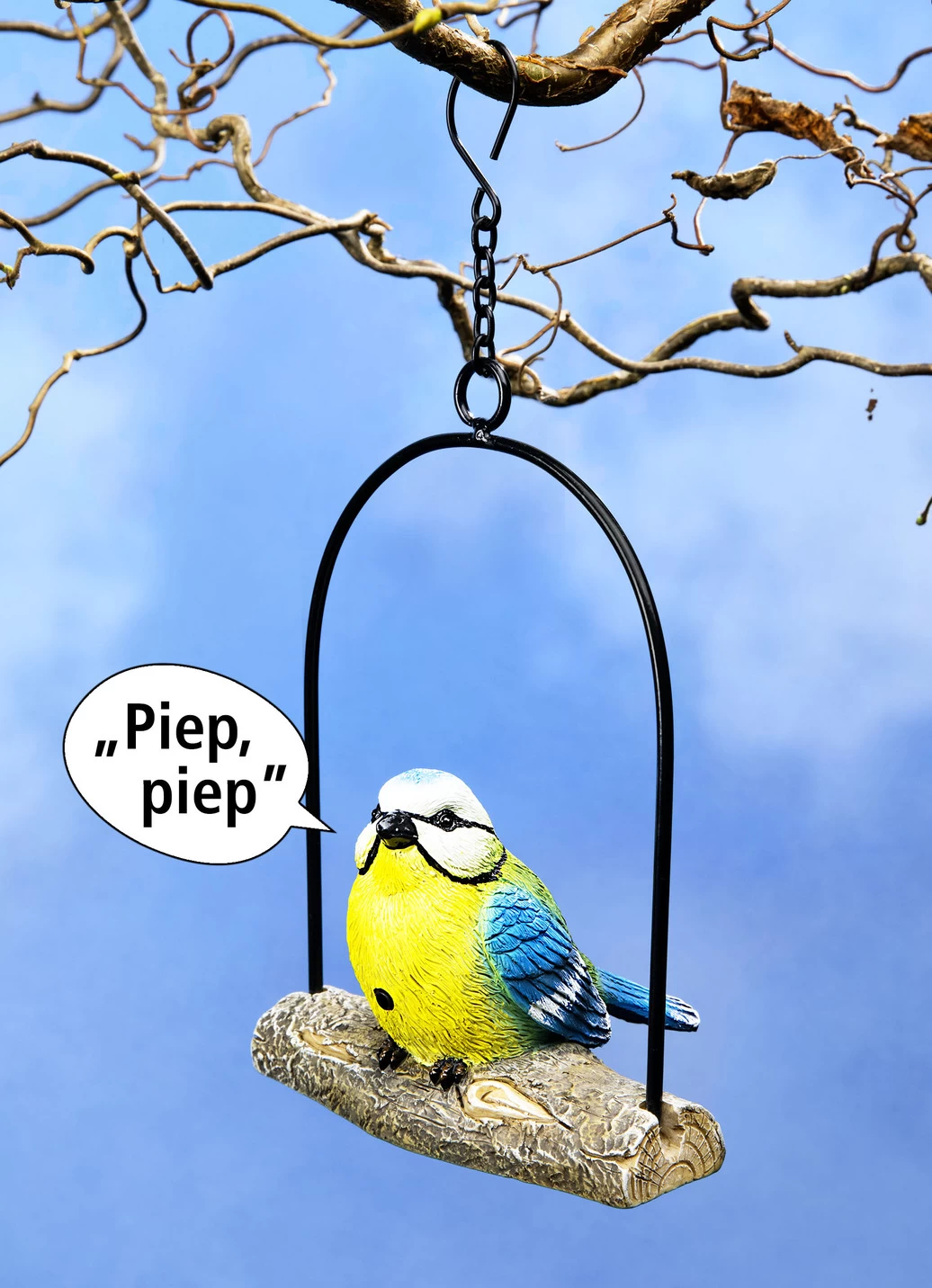 Diese kleine Blaumeise ist aufmerksamer als mancher Wachhund. Sobald sich jemand nähert, zwitschert sie dank eingebautem Bewegungsmelder unüberhörbar los. Mit Sensor im Bauch und Ein-/Ausschalter. Batteriebetrieb (2x LR44, im Lieferumfang enthalten). Aus Polyresin und Metall.
