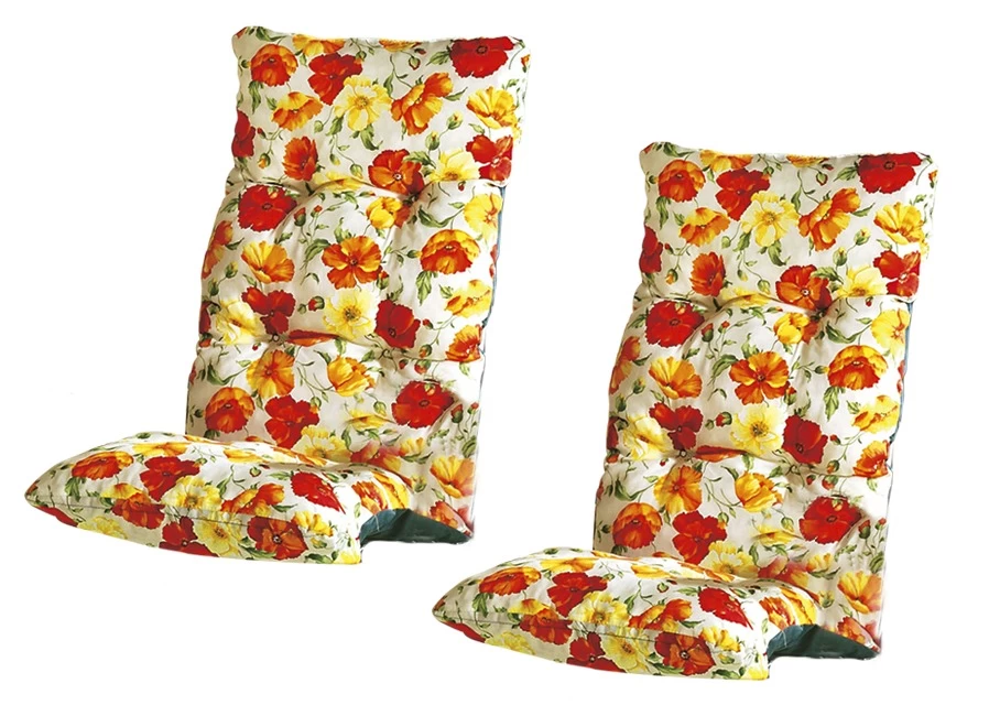 Bequeme, ca. 7 cm starke Auflagen und Kissen mit Schaumstoffflocken und Knopfsteppung; Oberseite aus Baumwolle, Unterseite aus Polypropylen