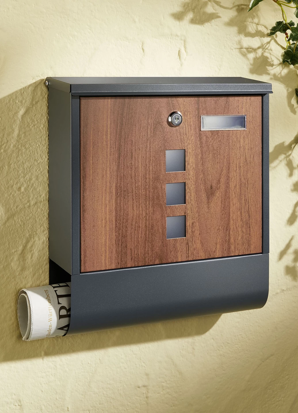 Dieser moderne Briefkasten aus verzinktem Metall mit Frontklappe in Holzoptik bietet Platz für Ihre Post und verfügt über eine Zeitungsrolle. So bleibt die Zeitung auch bei Regen gut geschützt. Mit Schloß, 2 Schlüsseln und Namensschildhalter. Maße: B30xH35,5xT10 cm, Zeitungsrolle-ø: 8 cm, Schlitzbreite 29,5 cm