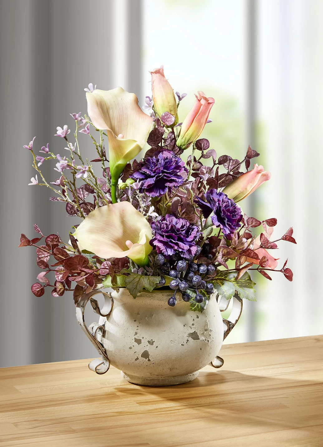 Ein Traum von einem Gesteck ist dieses üppig gestaltete Calla-Gesteck mit lilafarbenen Nelken, Blüten und Blattwerk sowie grünem Beiwerk. Eingesetzt in einen aus Metall gefertigten Valo-Topf mit Henkeln. Aus Kunst- und Textilmaterial gefertigt. Maße: Topf ø 12,5 cm, Höhe 12 cm; Gesamthöhe ca. 32 cm