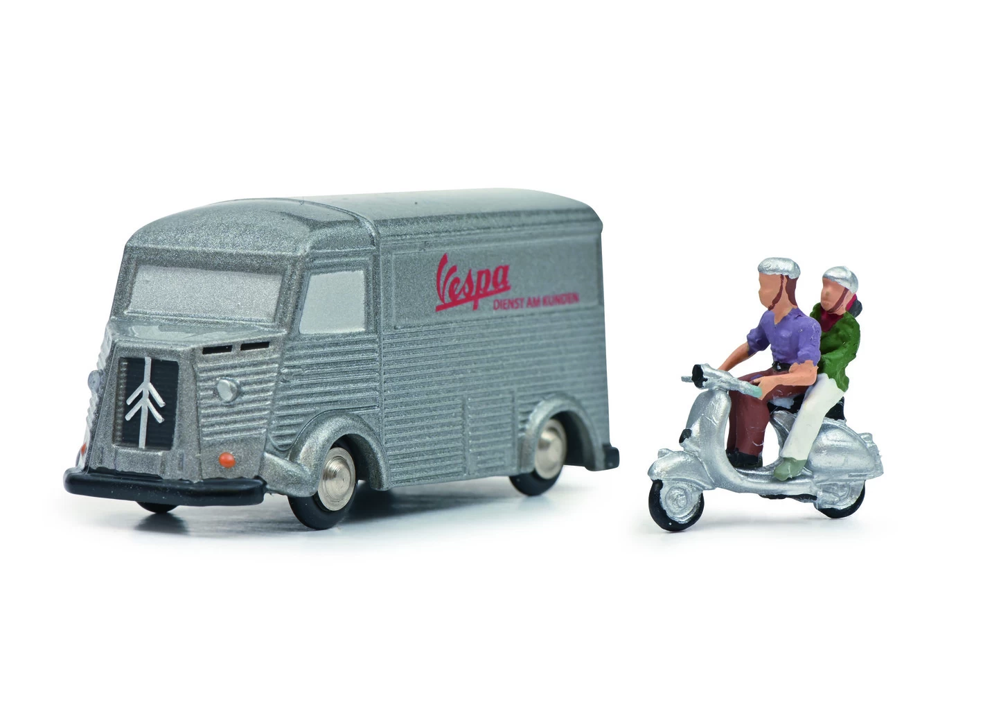 Citroen HY „Vespa“ und Vespa Roller + Figur in Silber.