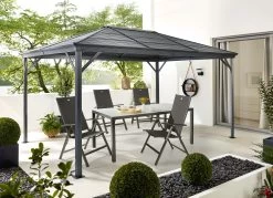 Dieser starke Pavillon trägt die außergewöhnliche Schneelast von 125 kg/m² und ist 100% dauerhaft rostfrei!Durch die galvanische Beschichtung rostet das Dach nicht, ist wasserdicht und hält Regen, Schnee oder Sonne problemlos Stand. Das gleiche gilt für die massive Konstruktion aus resistentem, pulverbeschichtetem Aluminium in edlem Basaltgrau, mit Schrauben aus rostfreiem Edelstahl. So trotzt der Pavillon ganzjährig Wind und Wetter. Passende Vorhänge (in Dunkelgrau) separat erhältlich. Höhe 261 cm. Mit Aufbau-Anleitung