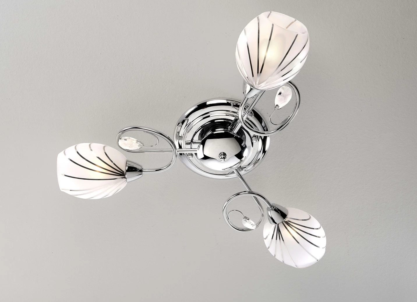 Deckenleuchte aus Metall und Glaslampenschirmen in der Ausführung 3-flammig und in Chrom.