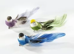 Dieses 3er-Set Vögel in den Farben Flieder, Grün und Blau ist ein entzückender Vorbote für das Frühjahr und kann mittels Metall-Clip an Ihrem Osterstrauß, Gestecken und Wandkränzen angebracht werden. Aus Styropor, mit Hühnerfedern verziert.