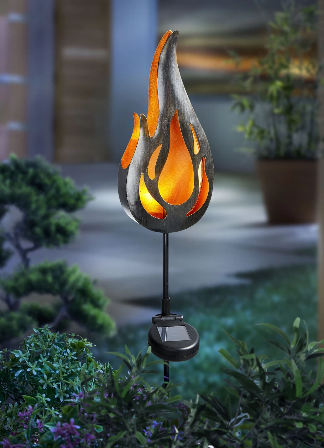 in Form einer Flamme. Nachdem sich das Solar-Paneel am Tage aufgeladen hat, wird die Energie nach Einbruch der Dämmerung über eine LED mit Flackereffekt wieder abgegeben. So können Sie schöne Lichtpunkte in Ihrem Außenbereich setzen. Aus Metall. Maße: B13xH86xT5 cm.