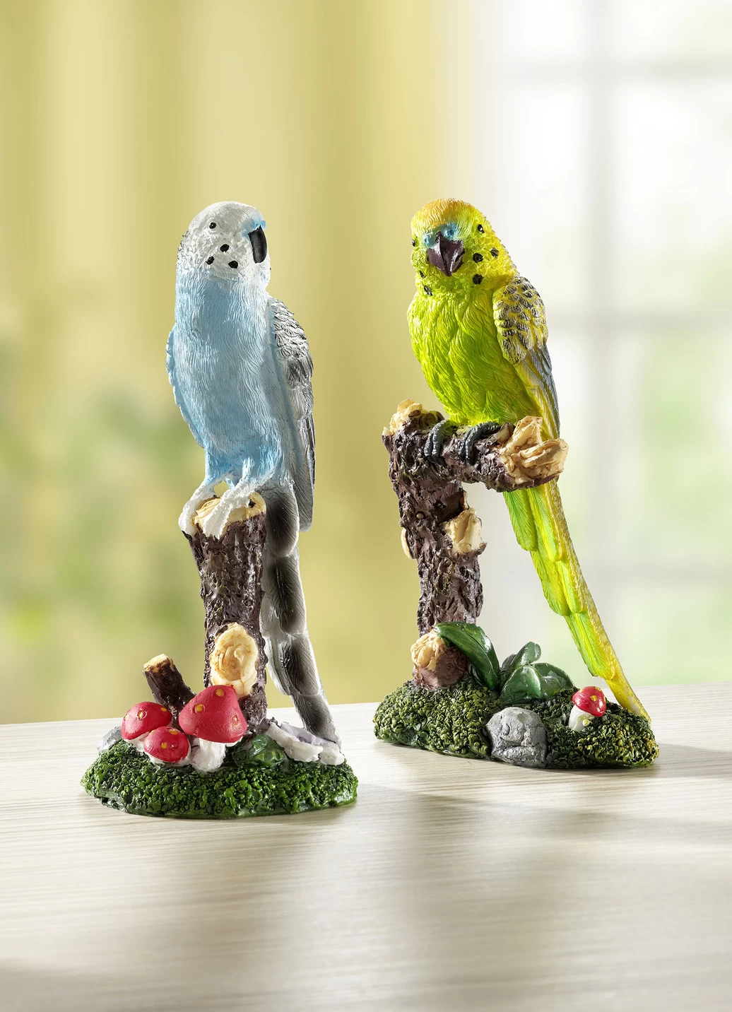 Diese putzigen Wellensittiche trällern freudig auf einem kleinen Baumstamm vor sich hin. Sehr naturgetreu und detailliert aus Polyresin gearbeitet.