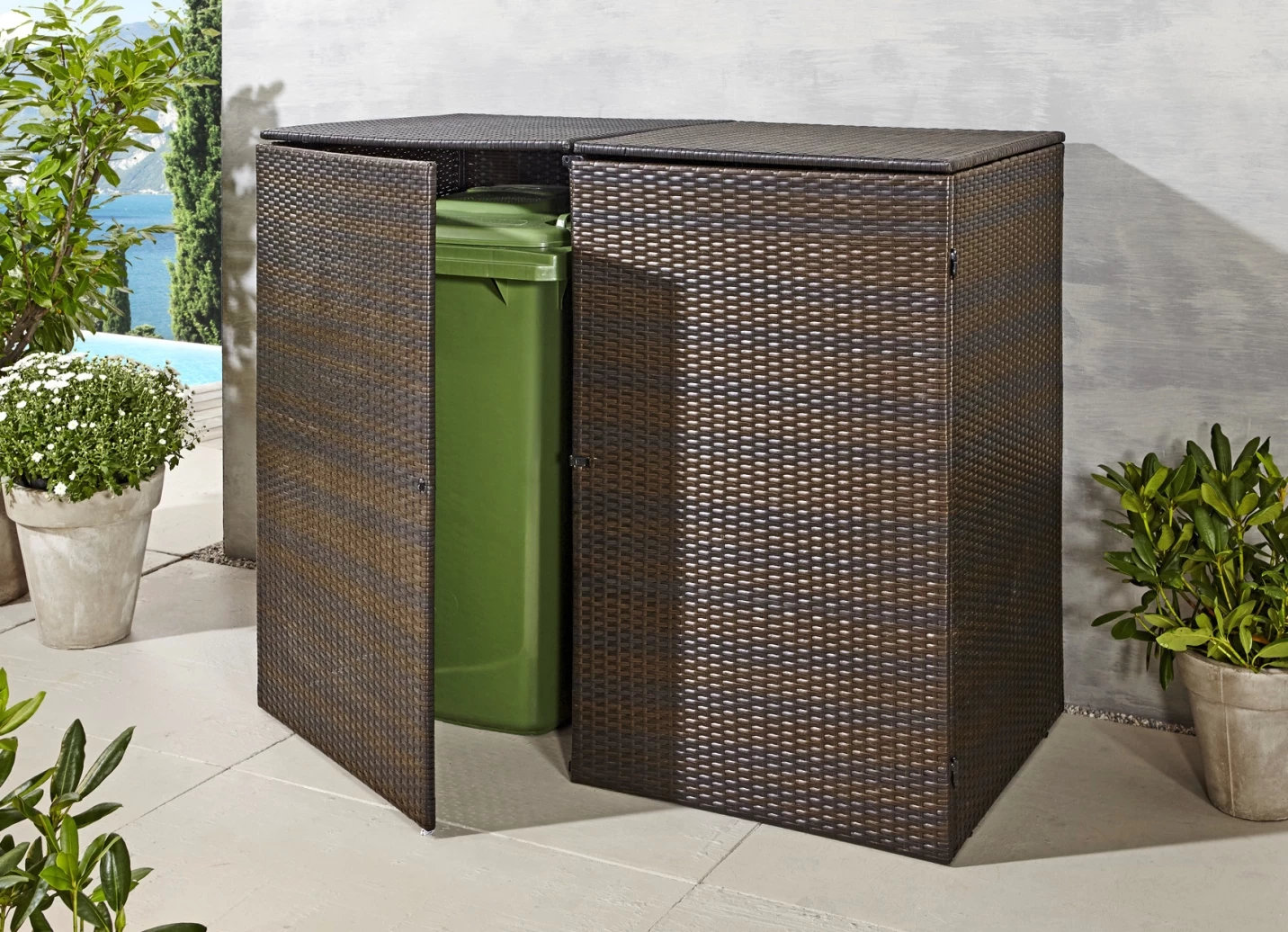 Doppel-Mülltonnenschrank mit witterungsbeständigem Kunststoffgeflecht