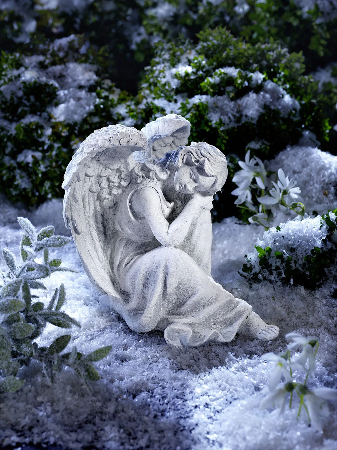 Dieser hinreißend gestaltete Engel sorgt für einen Hauch von Romantik in Ihrem Außenbereich. Verträumt blickt der Engel auf die Umgebung und sorgt auf der Terrasse, auf dem Balkon und im Garten für eine himmlische Stimmung. Auch als Grabschmuck ist dieses Modell hervorragend geeignet.