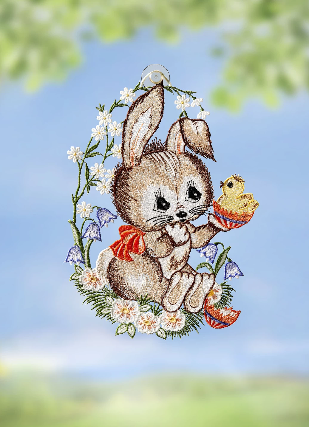 Dieses erstklassige Fensterbild aus echter Plauener Spitze mit dem niedlichen Hasen und seinem Freund dem Küken wird Ihren Ausblick garantiert verschönern. Mit Saughaken zum einfachen Aufhängen gefertigt. Die Qualität: 100% Polyester. Maße: H28xB21 cm.