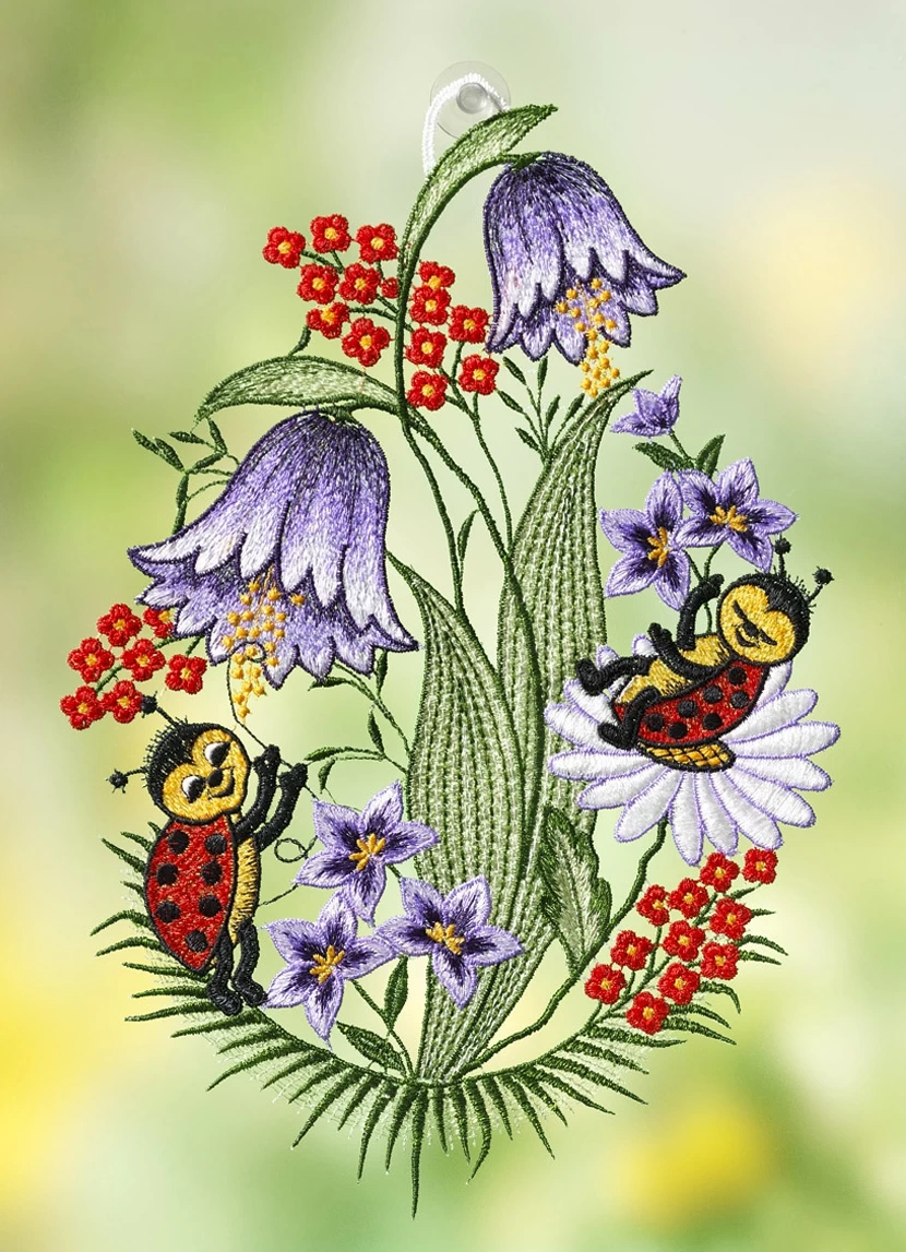Fensterbild Marienkäfer aus Plauener Spitze in Grün-Bunt.