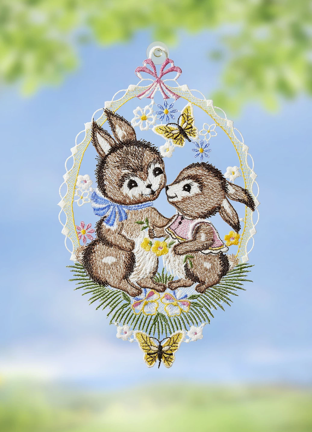 Dieses Fensterbild aus echter Plauener Spitze zeigt ein niedliches Hasenpaar, inmitten von Blumen und zwei Schmetterlingen. Mit Saughaken zur einfachen Befestigung. Aus 100% Polyester.