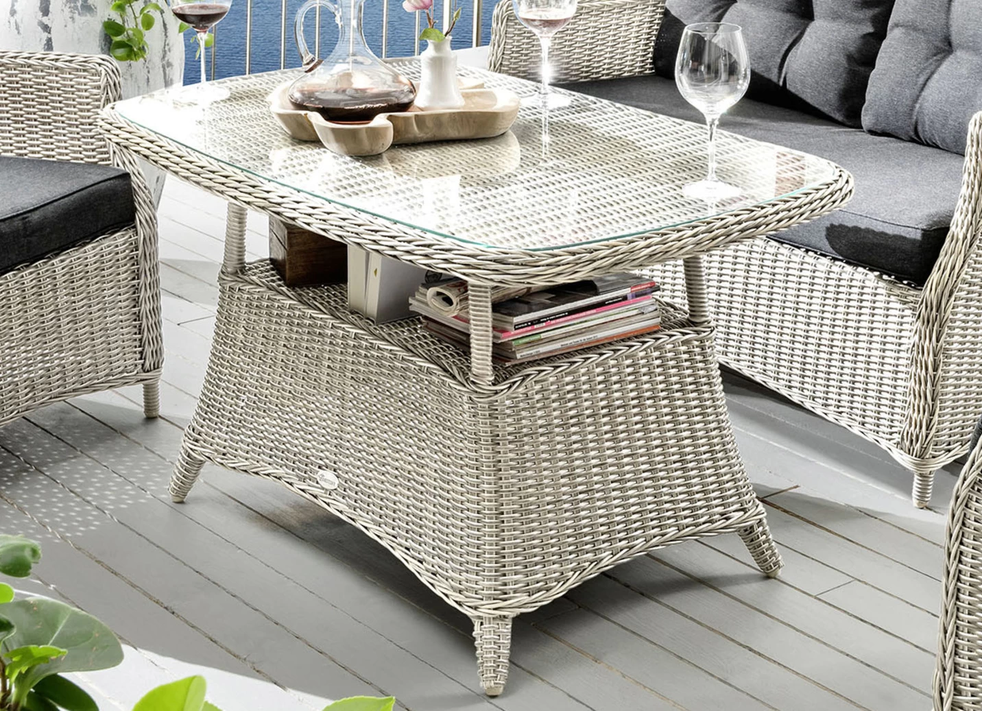 Mit diesen großzügigen Gartenmöbeln in Komforthöhe werden Garten und Terrasse zum Mittelpunkt der Geschehnisse! Die stabilen, rostfreien Aluminiumgestelle sind von Hand mit witterungs- und UV-beständigem Polyrattan umflochten (attraktives Rund- und Halbrundgeflecht).
