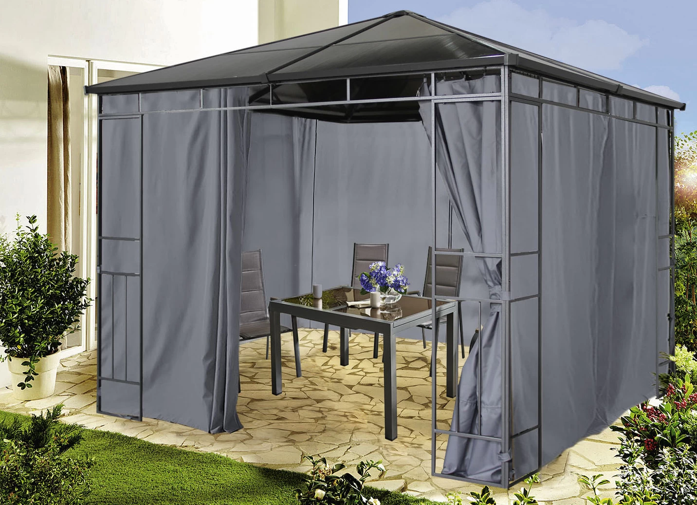 Hardtop-Pavillon Limone mit Seitenteilen in den Maßen 3×3 m und in Grau.