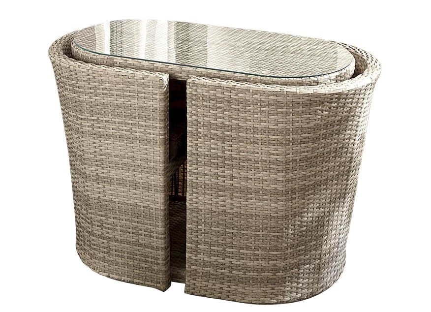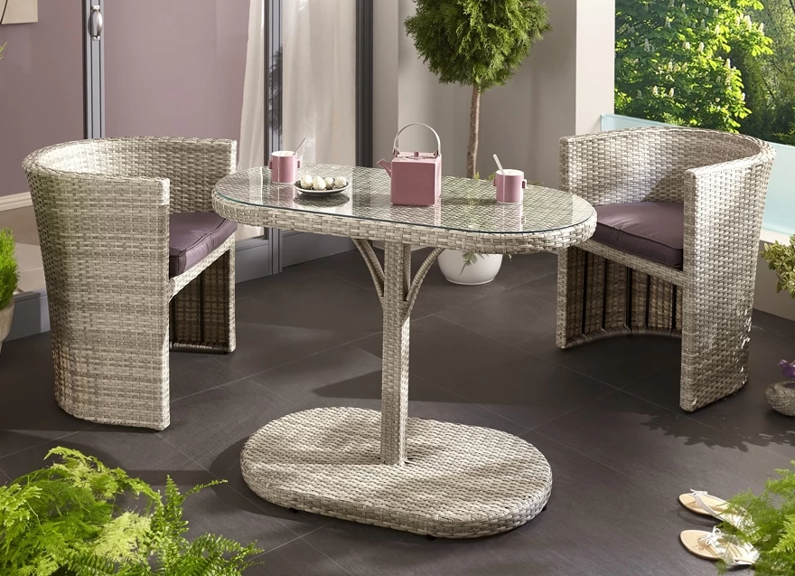 Praktisch: Die Sessel lassen sich nach Gebrauch bündig unter den formschönen Tisch mit Glasplatte schieben, sodass die Möbel selbst auf kleine Balkone passen. Passende Auflagen gehören dazu (Bezug: 100% Polyester).