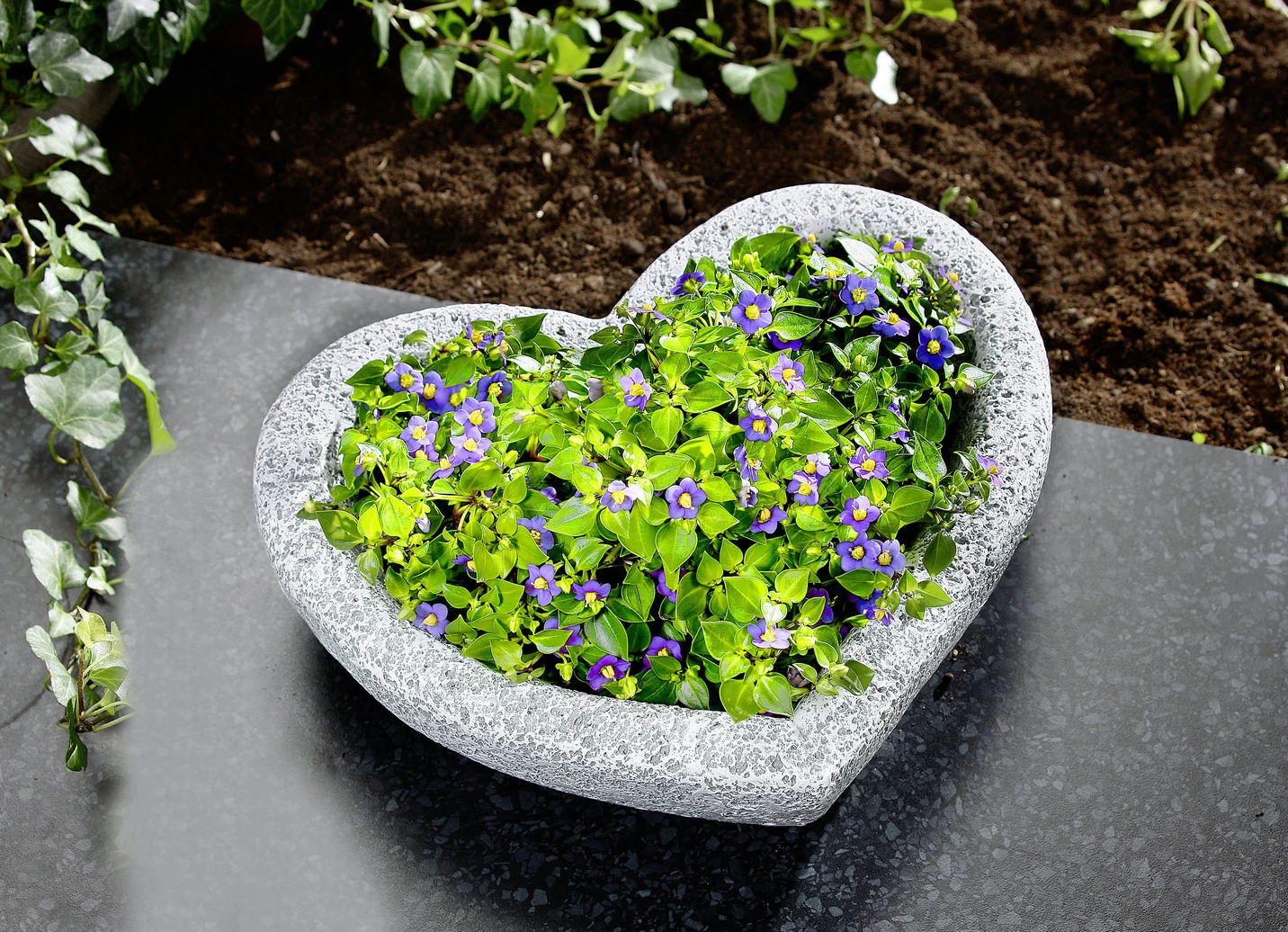 Herz-Pflanzschale aus wetterfestem Polyresin in Grau.