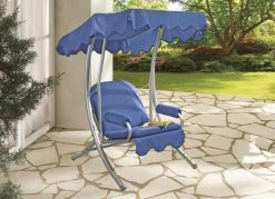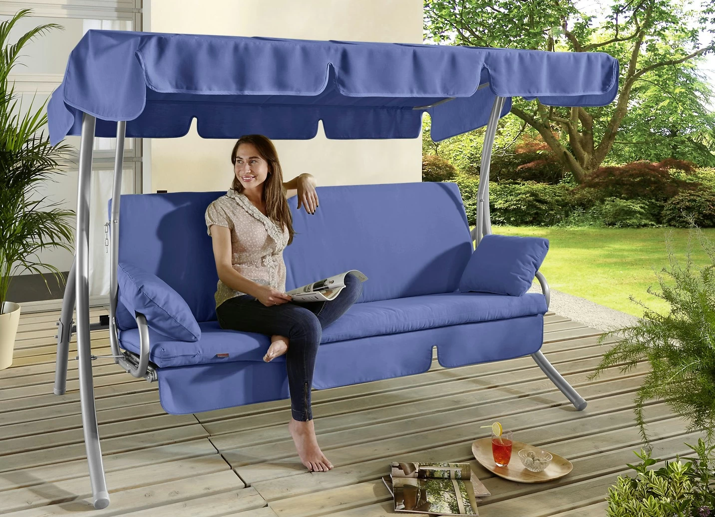 Hollywood-Schaukel mit Gestell aus verzinktem Stahlrohr in der Ausführung Single-Schaukel und in Blau.