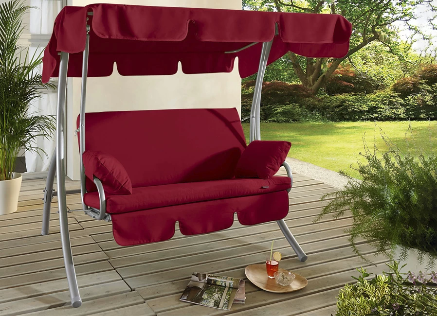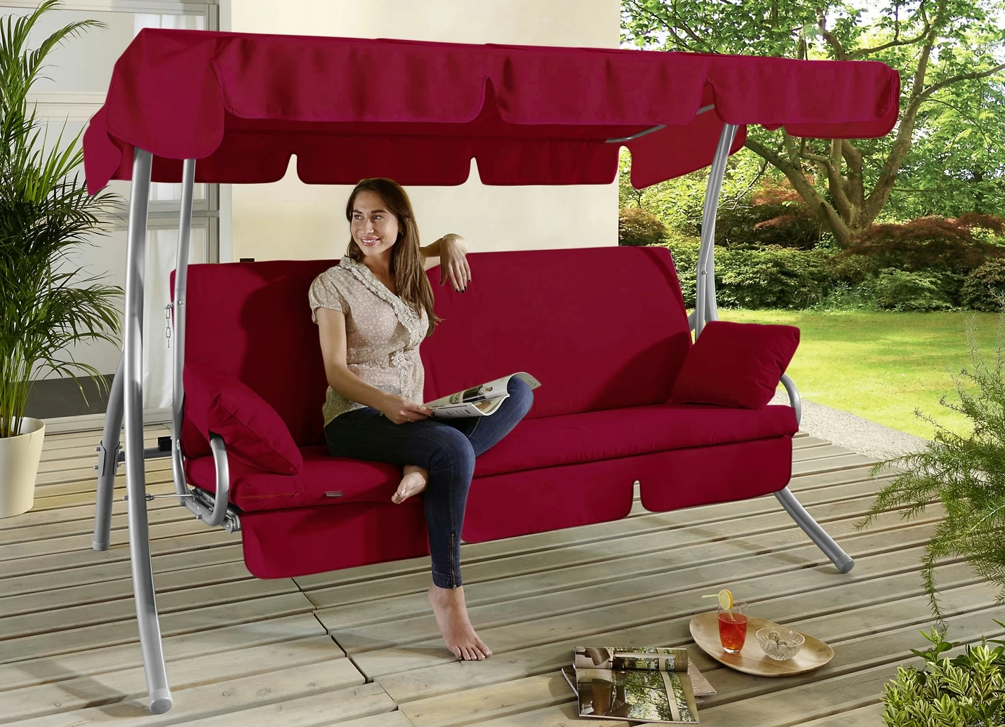 2- und 3-Sitzer zur Liegefläche klappbar. Bezüge mit Reißverschluss, waschbar bis 30 °C (außer Single-Schaukeln).