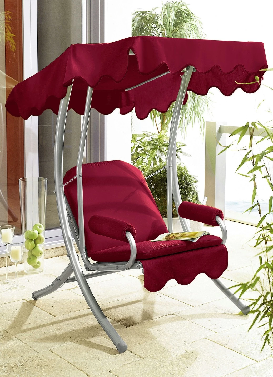 Bequeme Schaukeln mit silberfarbenem Gestell aus verzinktem, pulverbeschichtetem Stahlrohr und wasserabweisendem Sonnendach aus 100% Polyacryl (waschbar bis 30 °C). Sehr komfortable, 8 cm dicke Polsterung aus vliesummanteltem Schaumstoff mit strapazierfähigem Bezug aus 100% Polyacryl. Selbstmontage.
