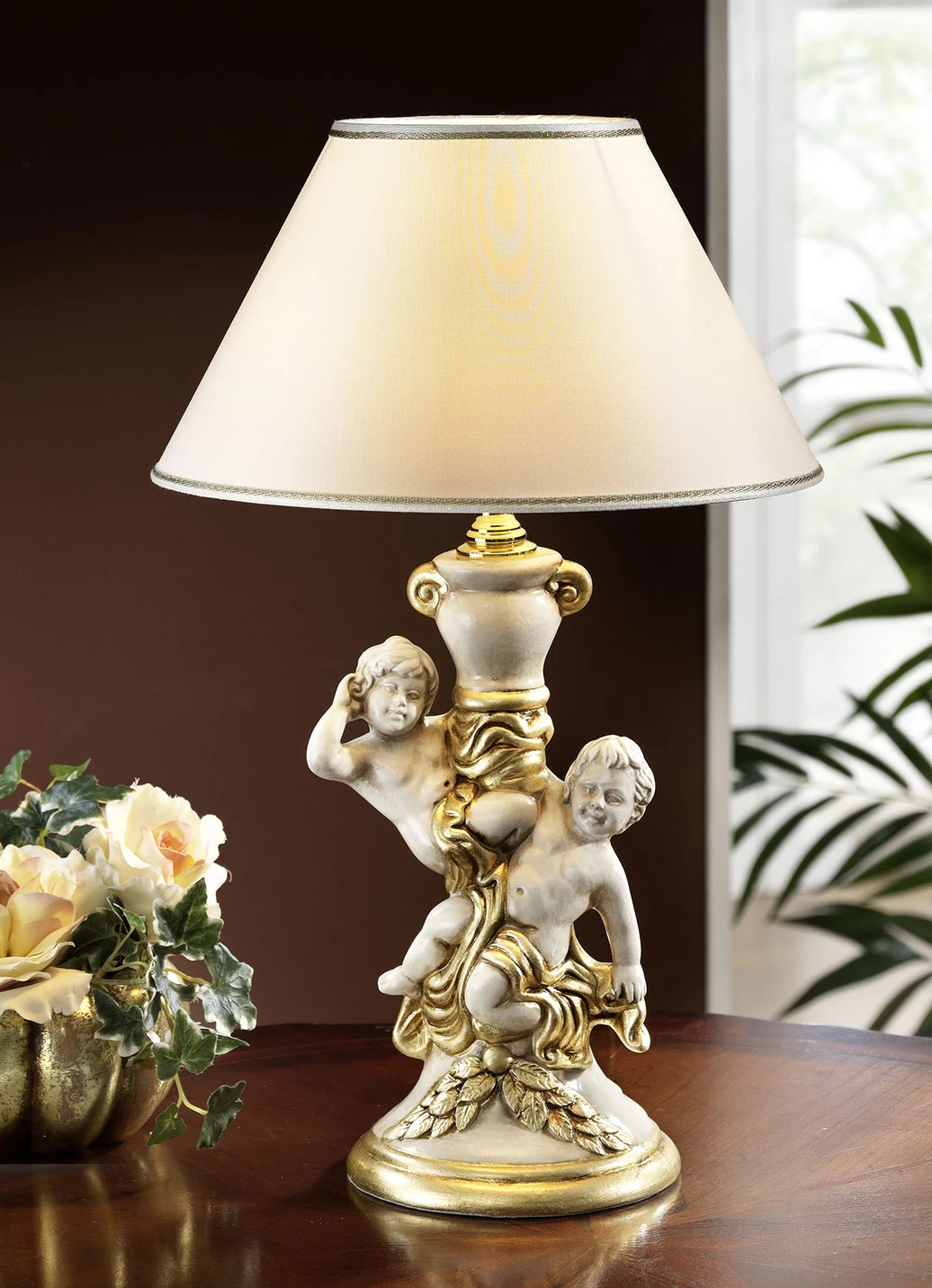 Perfekt für ein edles Ambiente ist diese wundervolle Tischleuchte! Auf dem Lampenfuß sitzen 2 Engel. Aus Keramik. In Handarbeit hergestellt und von Hand bemalt. Mit schönen, goldfarbenen Details sowie stoffbezogenem Lampenschirm (80% Baumwolle und 20% Polyester). Die Lieferung erfolgt ohne Leuchtmittel. 1x E27, max. 57 Watt, 230 Volt. Maße: Höhe 48 cm, ø 30 cm