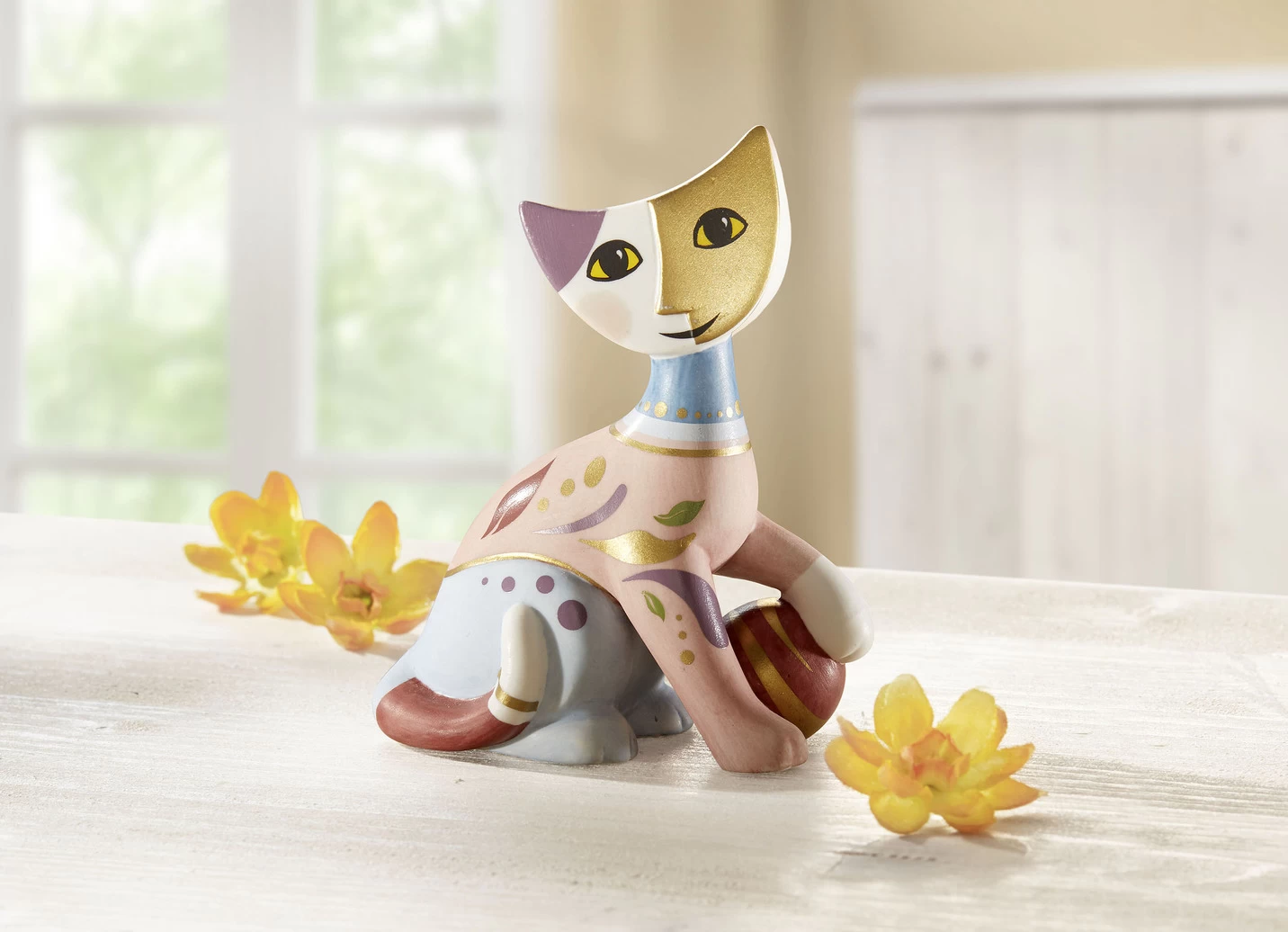 Urlaubsstimmung pur mit dezenten Farben aus dem Paradies bringt uns diese Katze mit. Von der Künstlerin Rosina Wachtmeister gestaltet und aus dem traditionsreichen Hause „Goebel“ aus Porzellan gefertigt und teilweise von Hand bemalt. Maße: B7,5xH8,5xT4 cm