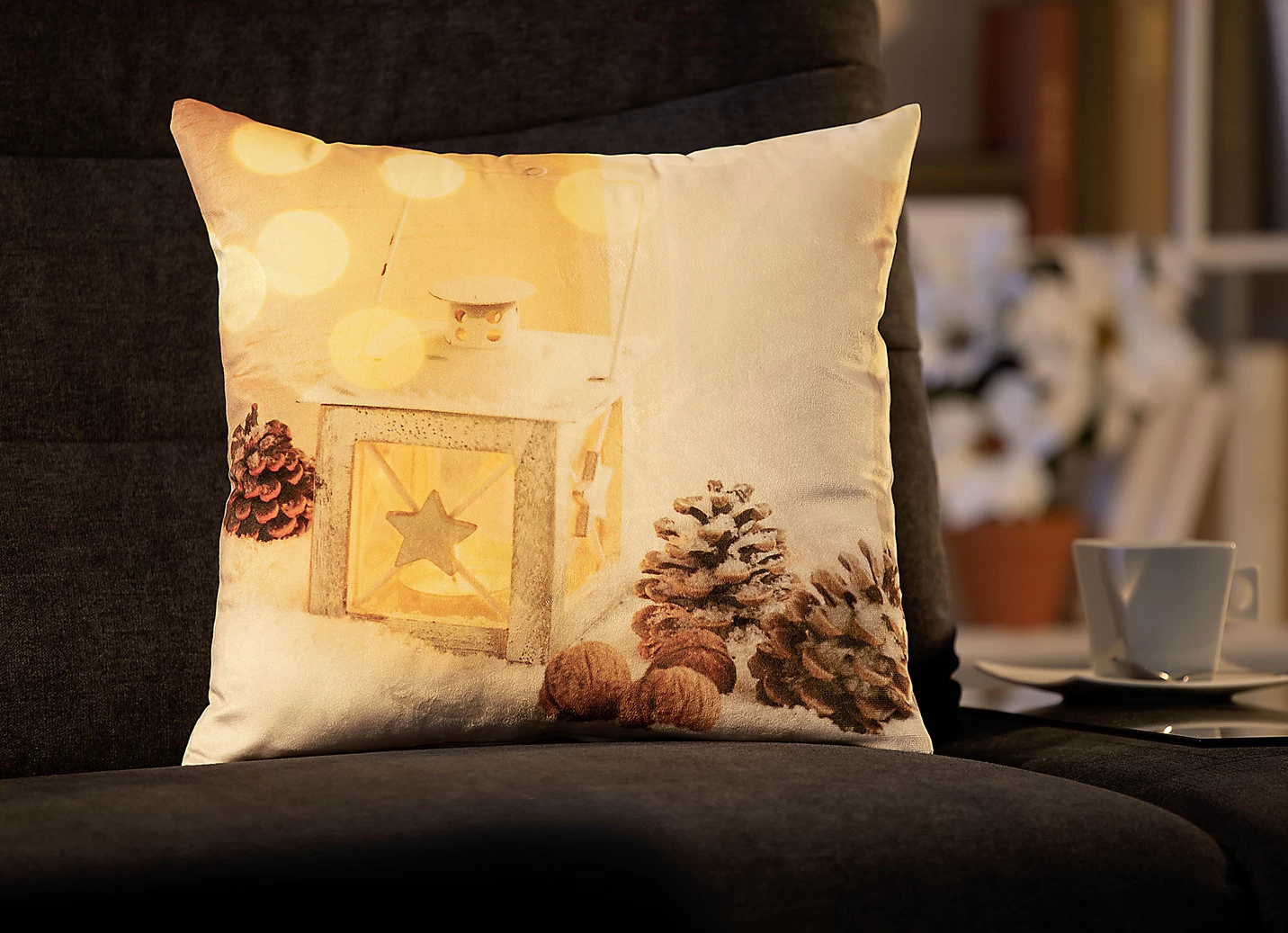 Ein herrlich weihnachtliches Ambiente zaubert dieser hervorragend digitalbedruckte Kissenbezug in Ihr Zuhause, der eine stimmungsvolle Laterne, Tannenzapfen und Walnüsse präsentiert. Mit praktischem Reißverschluss. Die Qualität: digitalbedruckter Samt aus 100% Polyester. Maße: 40×40 cm