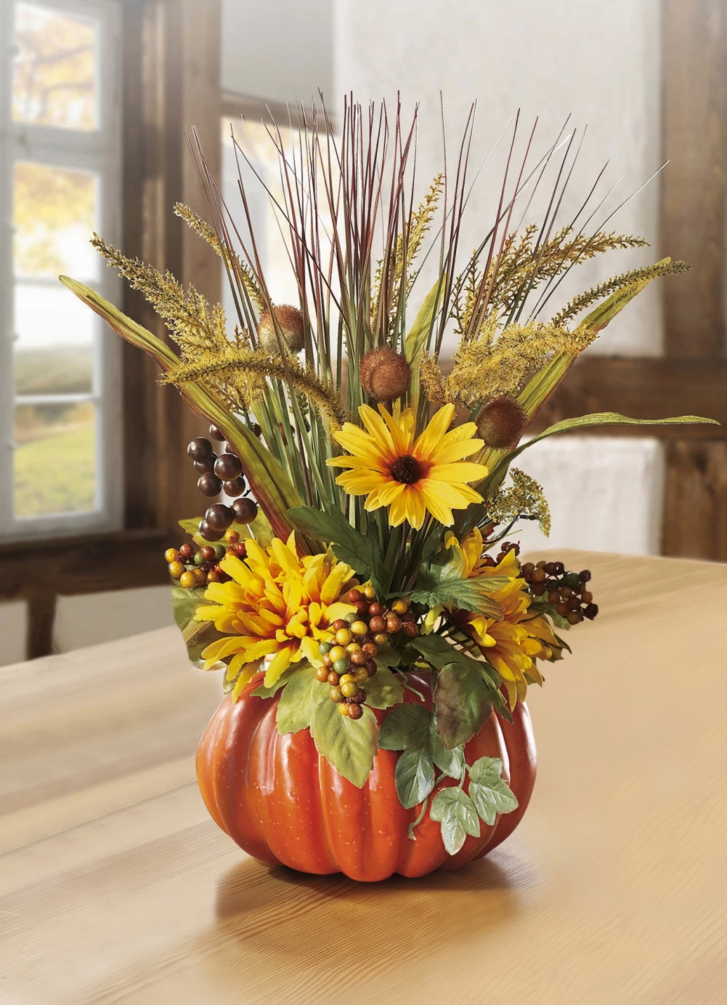 Dieses stilvolle, herbstliche Gesteck sollte in keinem Zuhause fehlen! In einen tollen Kürbistopf aus Kunstmaterial sind Gräser, Beeren, gelbe Blüten und bunte Blätter aus Textilmaterial fest eingesetzt. Maße: Topf ø 20 cm, Höhe 11 cm, Gesamthöhe ca. 41 cm