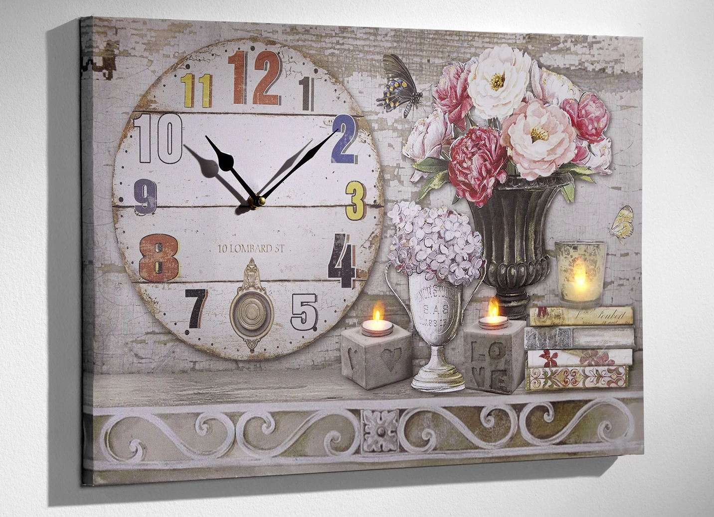 Dieses hübsche Bild zeigt einen schönen Blumenstrauß auf einem Regal. Daneben ist eine funktionsfähige Uhr mit bunten, arabischen Ziffern. Außerdem 3 Kerzen, die jeweils mit einer LED beleuchtet werden. Mit Ein-/Aus-Schalter. Batteriebetrieben mit 3x 1,5 Volt Mignon (nicht im Lieferumfang enthalten). Maße: B60xH39,5xT2,5 cm