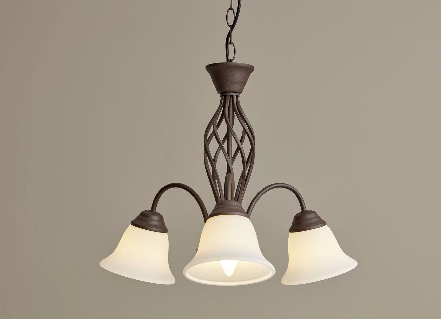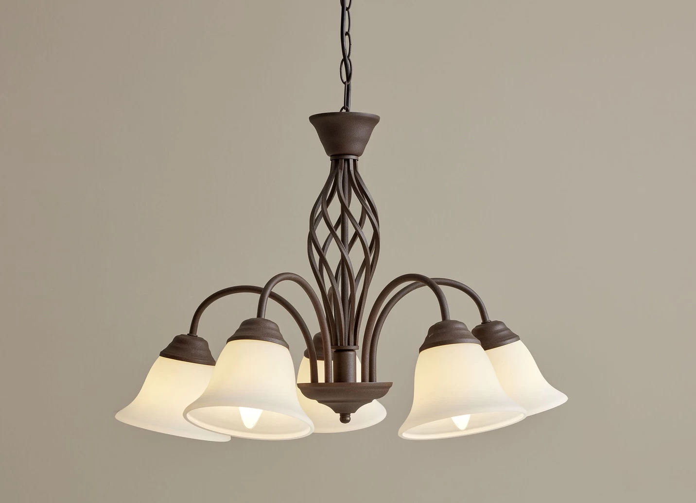 Rustikalen Charme verbreitet diese klassisch schöne Deckenleuchte. Aus antik rostfarbenem Metall mit weißen Glasschirmen gefertigt. Jeweils 230 Volt. Die Lieferung erfolgt ohne Leuchtmittel. Mit Aufbau-Anleitung