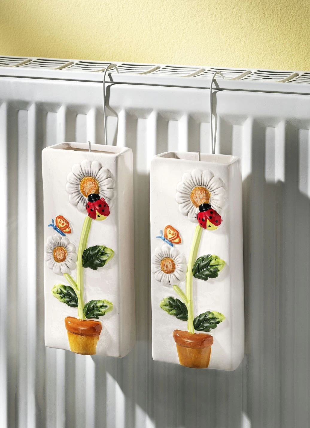 Dekoratives, 2-teiliges Luftbefeuchter-Set aus Kunststein mit plastischen Blumenmotiven und Marienkäfer dekoriert. Lieferung erfolgt mit Aufhängehaken für Heizkörper. Füllmenge ca. 250 ml.