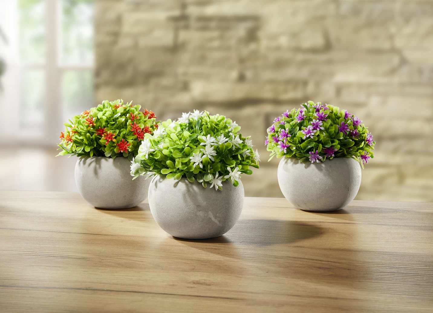 Diese bezaubernden Mini-Blüten im 3er-Set wurden zusammen mit grünem Beiwerk in kleine Zementtöpfe eingesetzt. Die Blüten haben die Farben weiß, orange und lila. Aus hochwertigem Kunstmaterial hergestellt. Maße: Je ca. ø 12, Höhe 12 cm.