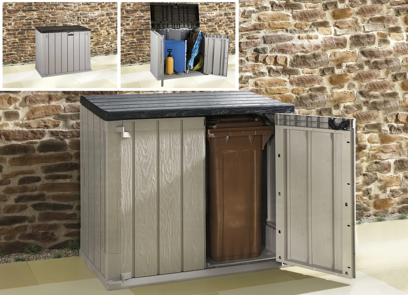 Verstauen Sie Ihre Mülltonnen, Gartengeräte oder sonstige Utensilien praktisch und schnell in dieser Mülltonnenbox. Die aus Polypropylen in Holzoptik gefertigte Box ist UV- und witterungsbeständig und hat ein Fassungsvermögen von 840 l (bietet Platz für 2 Mülltonnen à 120 l).