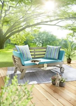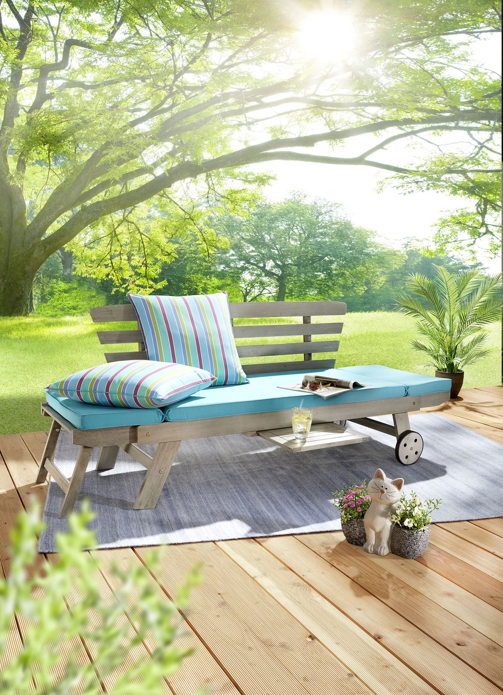 Die Bank „Maui“ bietet nicht nur gemütliche Sitzplätze für zwei Personen, sondern ist auch als Liege nutzbar – einfach Armlehnen herunterklappen, auf Stützen abstellen, fertig ist die Liegefläche. Wer gerne Getränke und Snacks griffbereit hat, wird den kleinen, ausziehbaren Tisch lieben, der sich unter der Sitzfläche verbirgt. Er fällt bei Nichtgebrauch gar nicht auf. Dank der zwei Rollen lässt sie sich einfach verschieben. Aus besonders hartem und widerstandsfähigem Akazienholz (FSC®) gefertigt. Die Kissen aus 100% PES sind im Lieferumfang enthalten. Mit Aufbau-Anleitung.