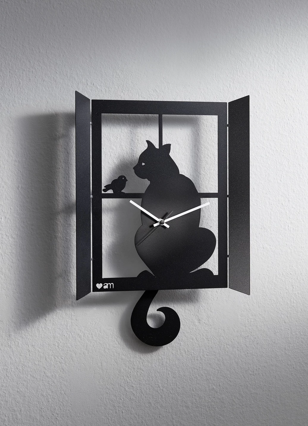 Ein toller Blickfang in Ihrem Zuhause wird diese originelle Wanduhr mit dem Motiv einer Katze am Fenster. Der Schwanz der Katze dient dabei als Pendel. Sie ist aus Eisen gefertigt und schwarz lackiert. Die Zeiger sind weiß. Mit hochwertigem Quarzwerk. Batteriebetrieben mit 1x 1,5 Volt Mignon (nicht im Lieferumfang enthalten). Maße: B30xH34xT5 cm