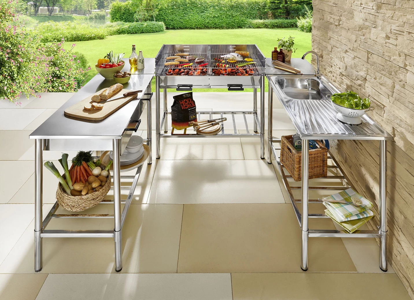 Erfüllen Sie sich den Traum einer Outdoor-Küche zum erschwinglichen Preis. Die Elemente aus Edelstahl (18/10) können einzeln oder zusammen aufgestellt werden und sind ideal für den heimischen Garten oder auch zum Camping. Alle Beine sind einzeln höhenverstellbar. Mit Aufbau-Anleitung