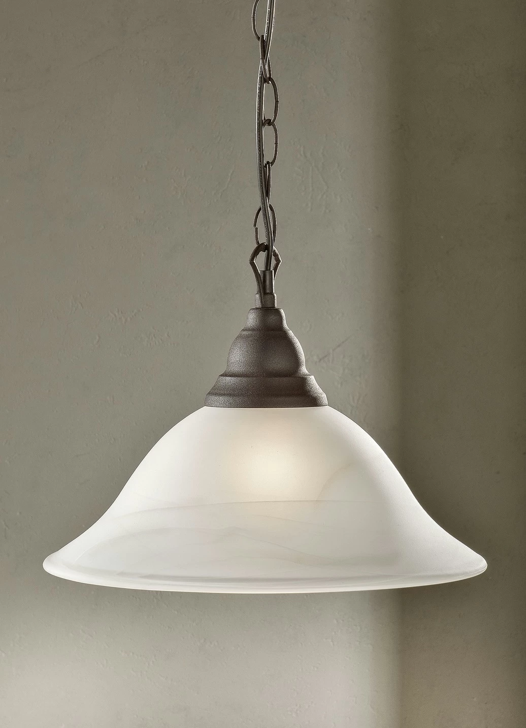 Exklusive Pendelleuchte mit geschwungenem Gestell aus antik rostfarbenem Metall sowie Schirm aus weißem Alabaster-Glas. Lieferung ohne Leuchtmittel. Mit Aufbau-Anleitung
