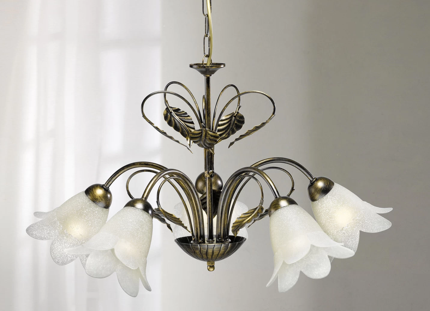 Pendelleuchte, 5-flammig aus Metall mit dekorativem Blattwerk