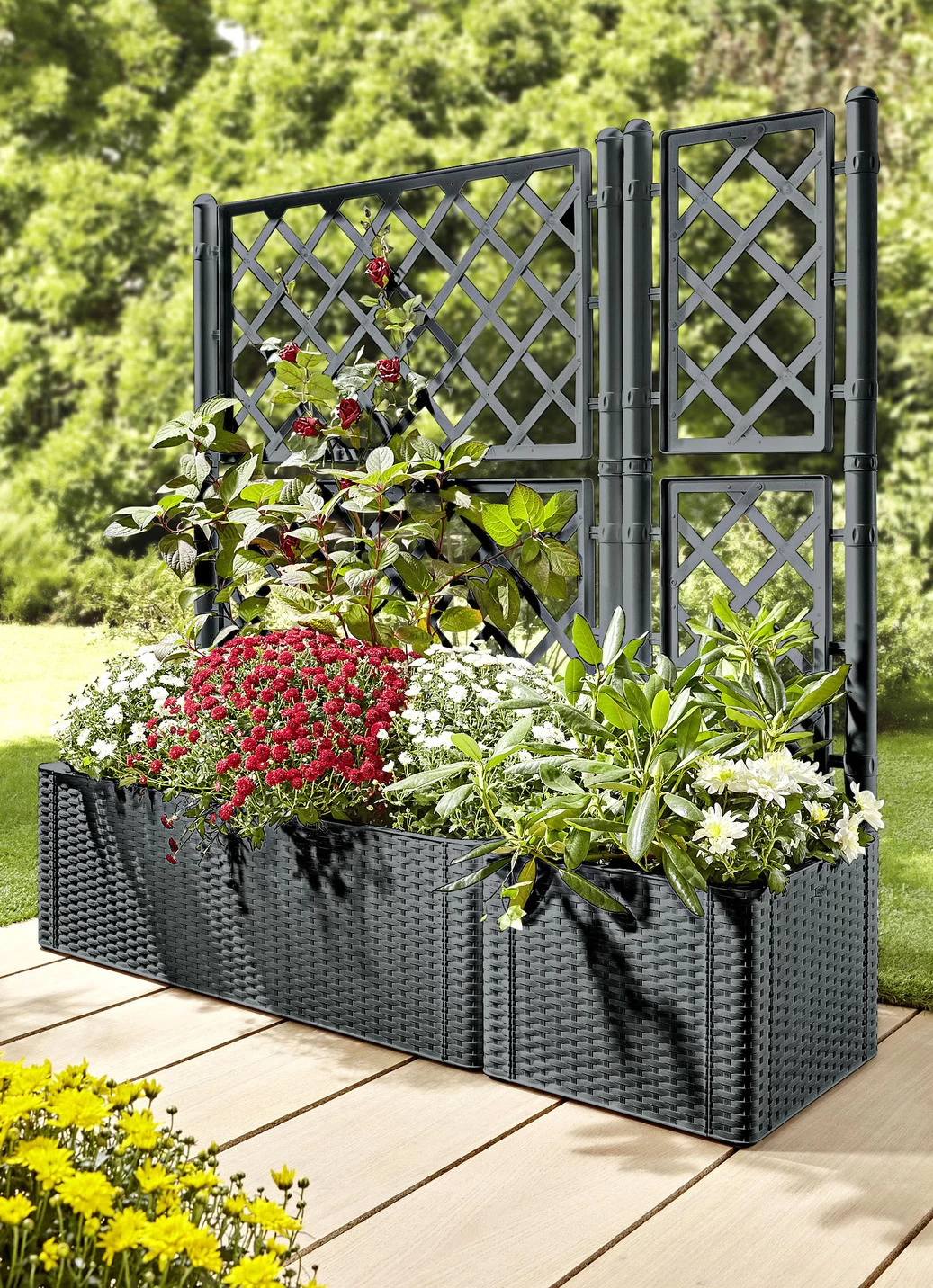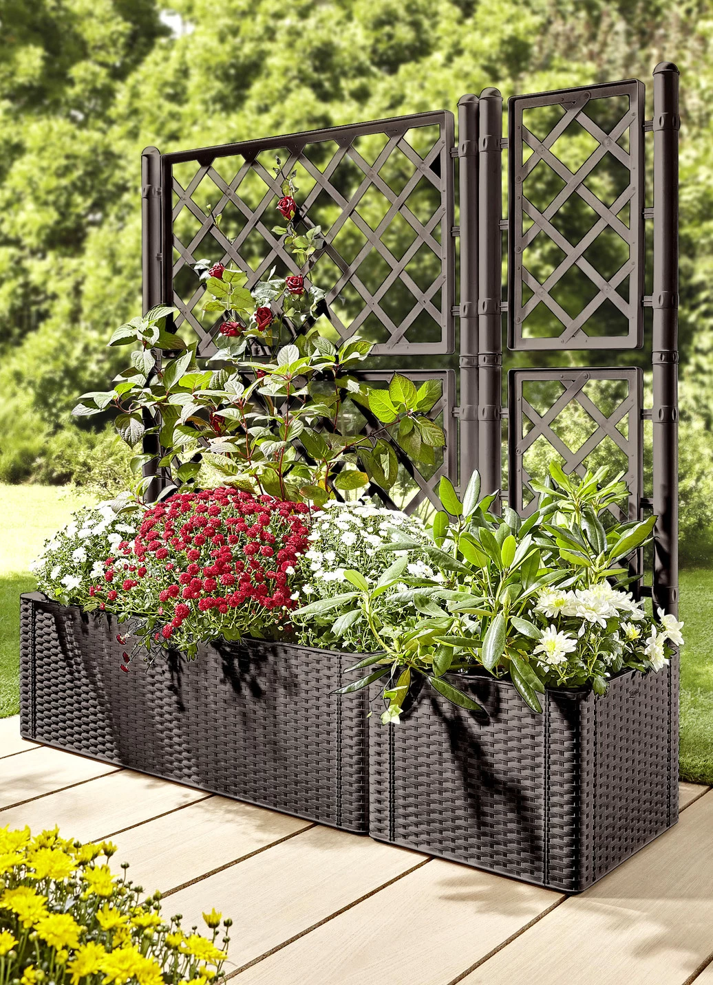 Attraktive Abgrenzung vor lästigen Blicken, Schutz vor Sonneneinstrahlung und dekorative Rankhilfe! Diese Pflanzkästen in moderner Rattan-Optik bieten reichlich Platz für Ihre Lieblingspflanzen und dank des Bewässerungssystems können Sie Terrasse oder Balkon nach Herzenslust begrünen – ganz ohne Gieß-Stress. Aus stabilem, pflegeleichtem und wetterbeständigem Kunststoff.