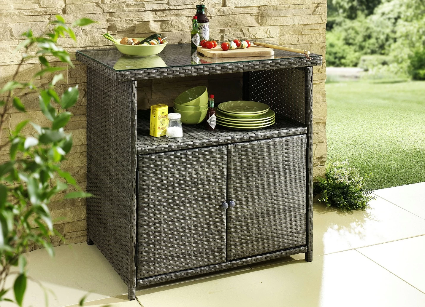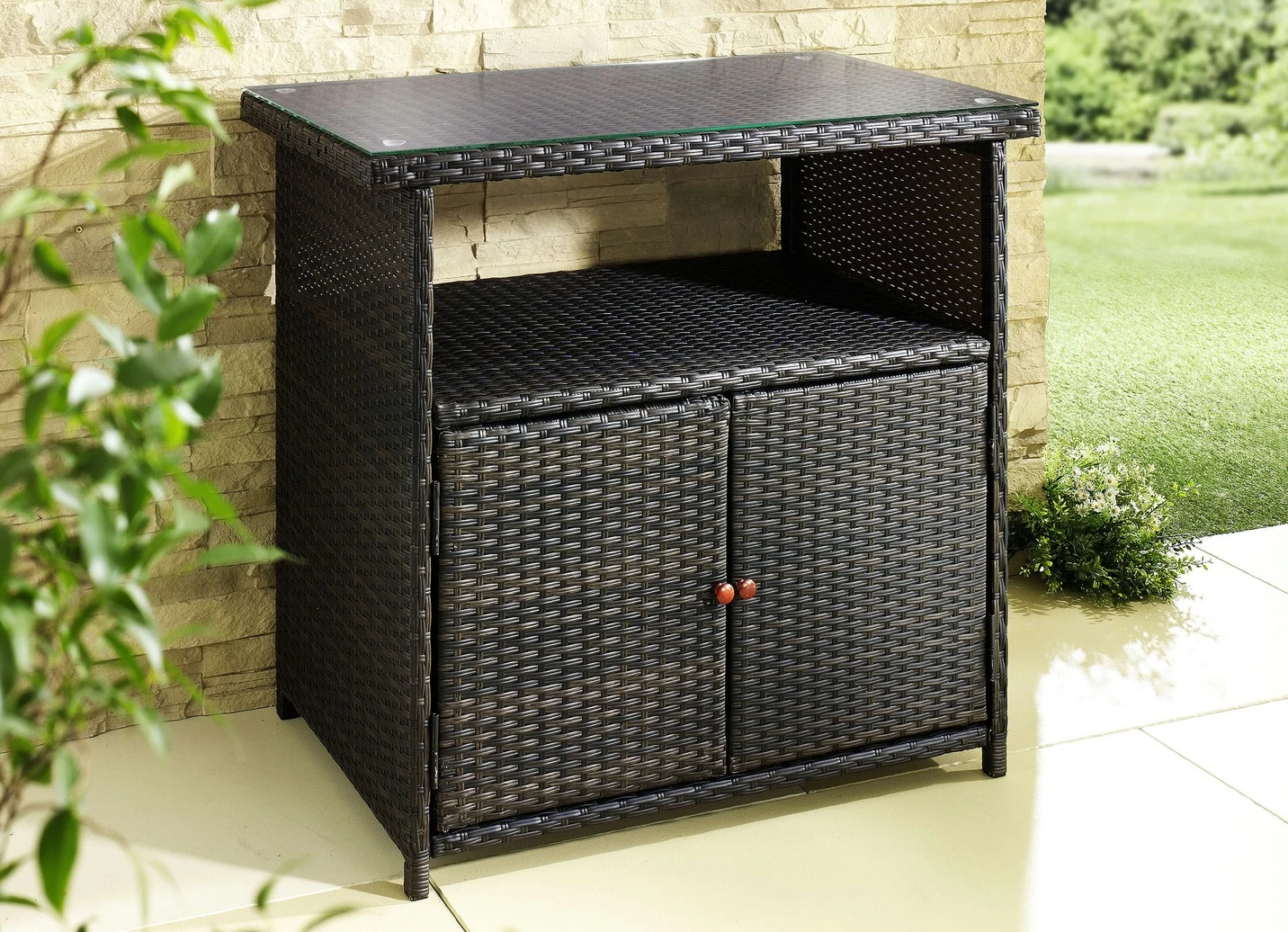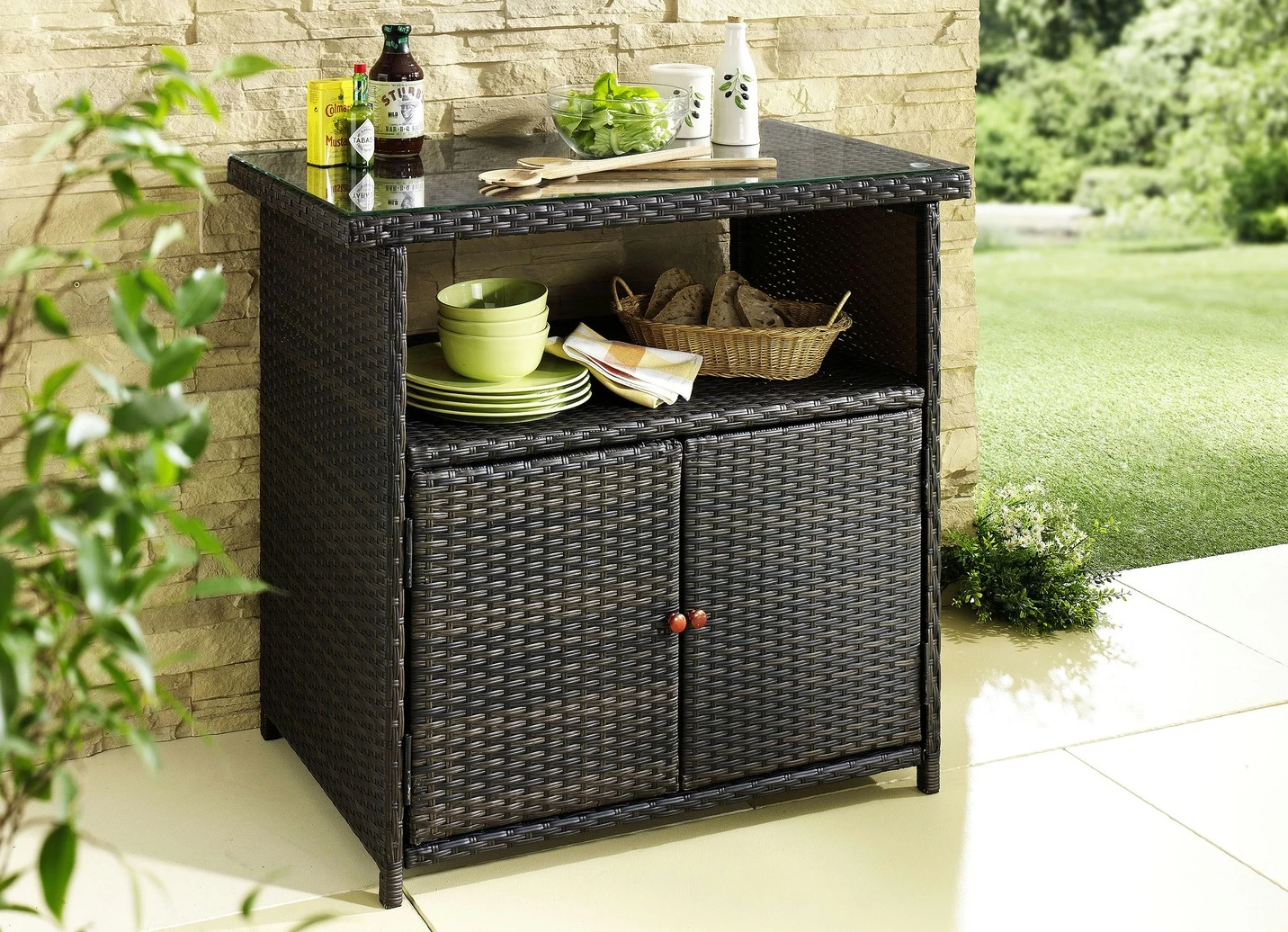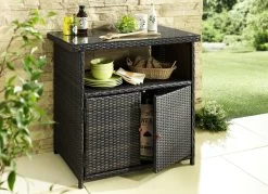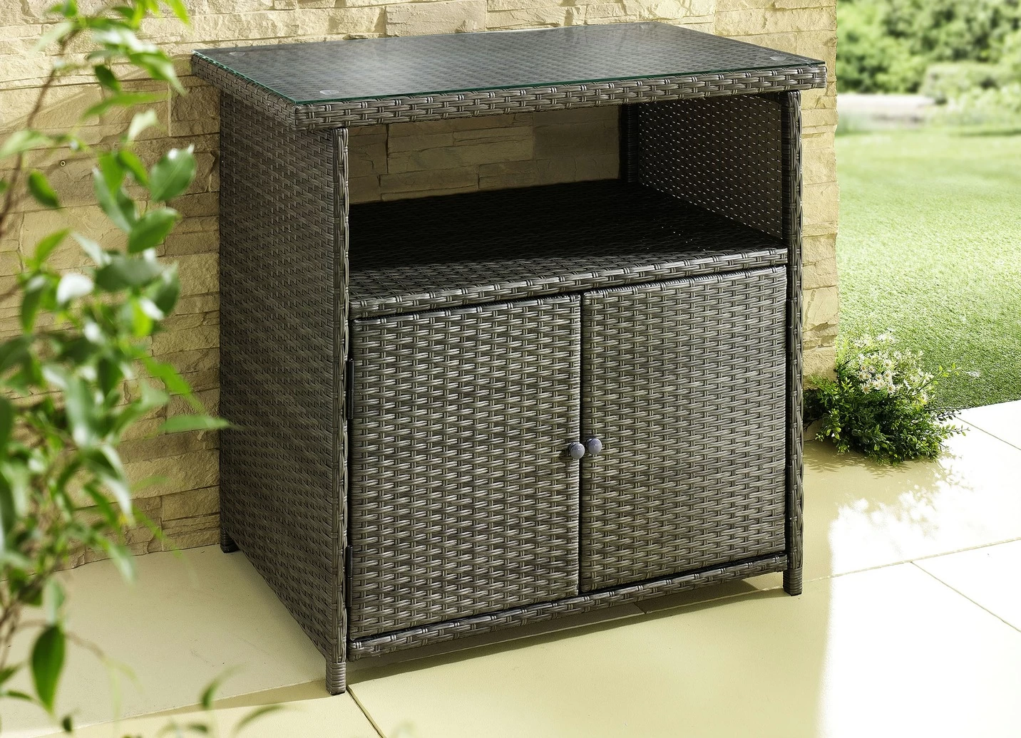 Das Kunststoffgeflecht im modernen Rattan-Look ist auf ein stabiles Aluminiumgestell gearbeitet. Mit 5 mm dicker Glasplatte, Schrankfach mit 2 Türen und 1 großen, offenen Ablagefach.