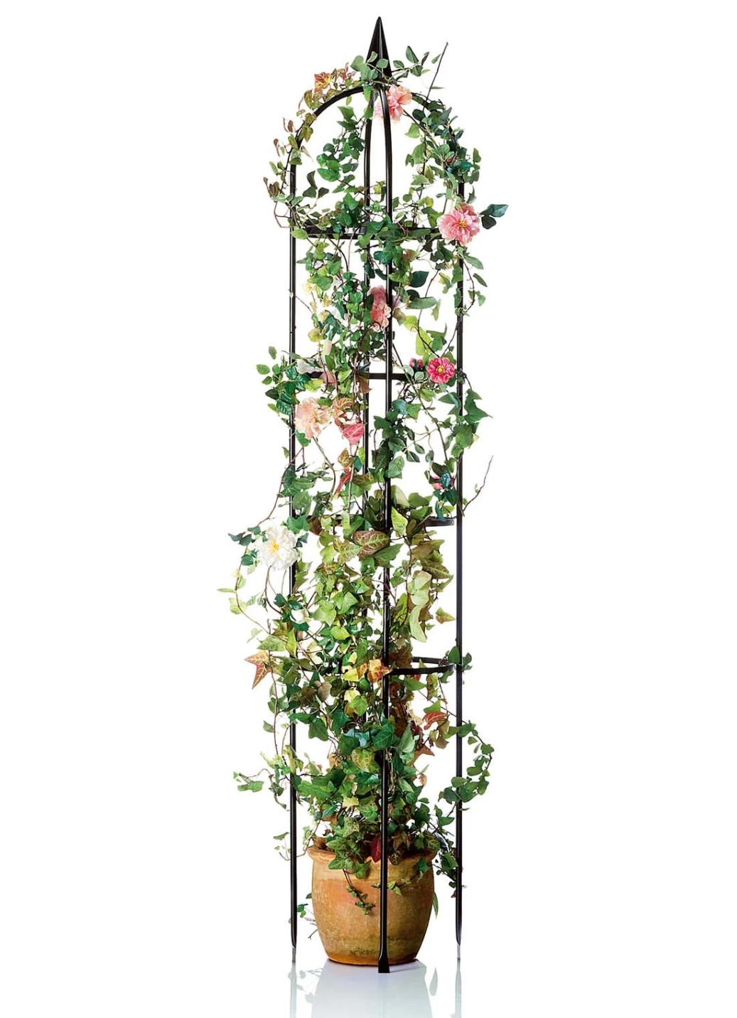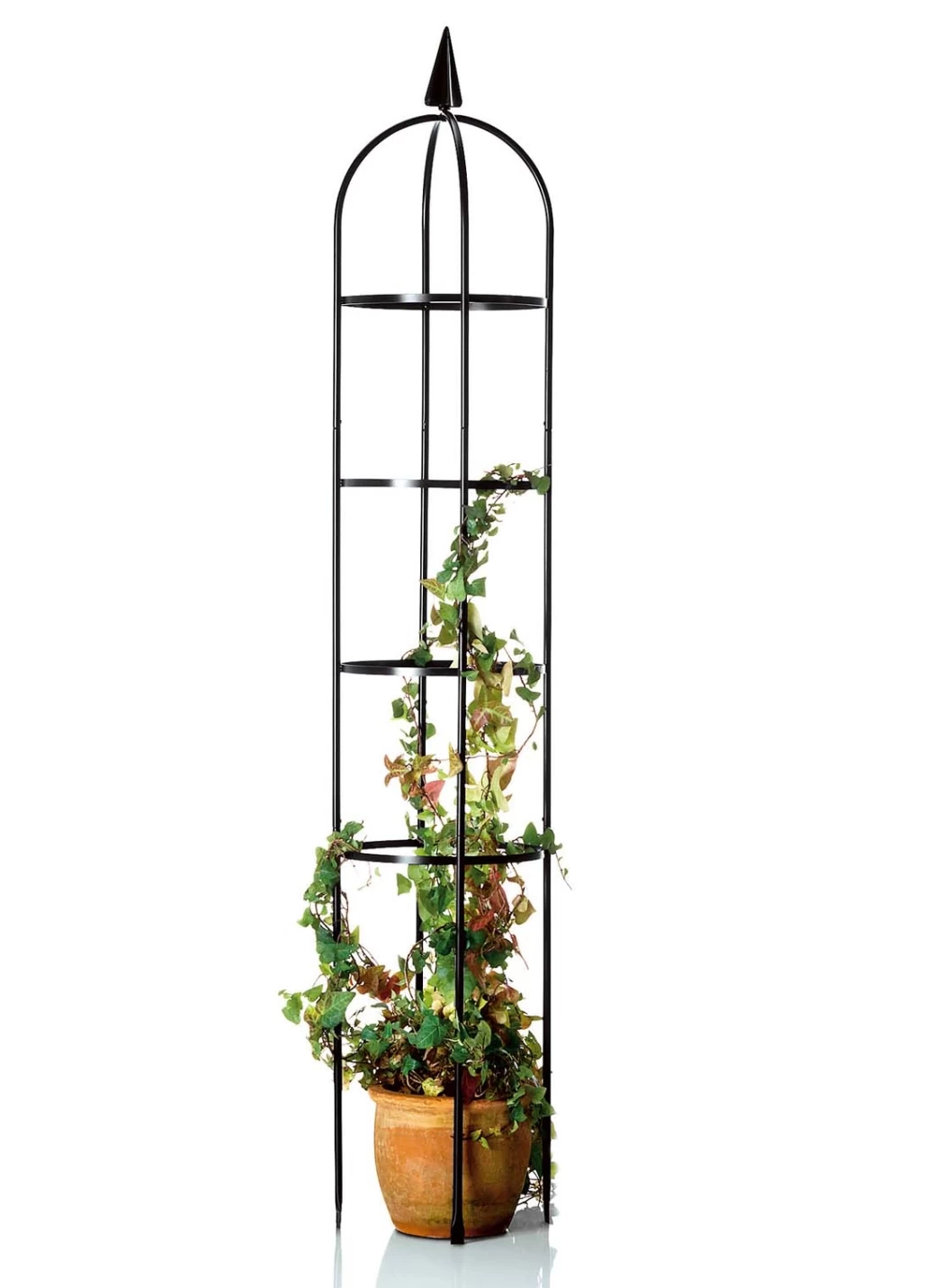 Dieses praktische, schwarze Rankgitter mit 4 Pflanzringen ist aus robustem Metall gearbeitet. Selbstmontage. Maße: ø 38 cm, Höhe 240 cm