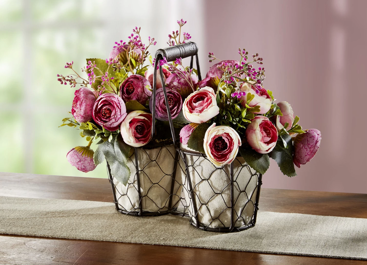 Wunderschönes Ranunkel-Gesteck mit verschiedenen Blüten, Beeren und grünem Beiwerk. Es wurde in ein Metall-Körbchen mit Henkel eingesetzt. Aus hochwertigem Kunstund Textilmaterial gefertigt.