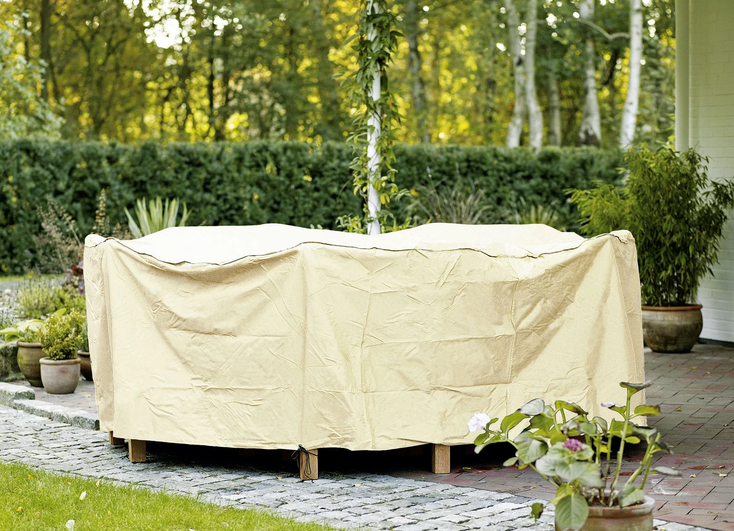 Die hochwertigen Schutzhüllen sind reißfest, witterungsbeständig und atmungsaktiv. Sie schützen Gartenmöbel oder ganze Tischgruppen vor Wind und Wetter. Sie bestehen aus fest gewebtem Polyester (100%) und sind mit Ösen sowie Schnur für optimalen Halt ausgestattet.