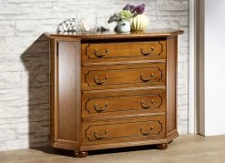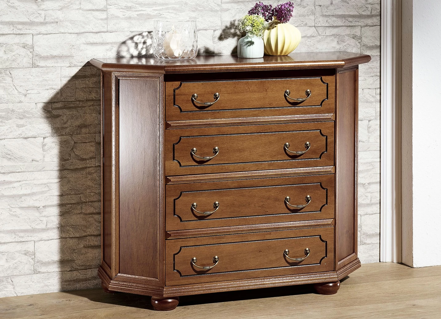 Schöne teilmassive Schubladenkommode mit detailreichen Schnitzereien sowie goldfarbenen Metallgriffen. Mit 4 Schubladen. Maße: B85xH72xT35 cm. Die Lieferung erfolgt aufgebaut